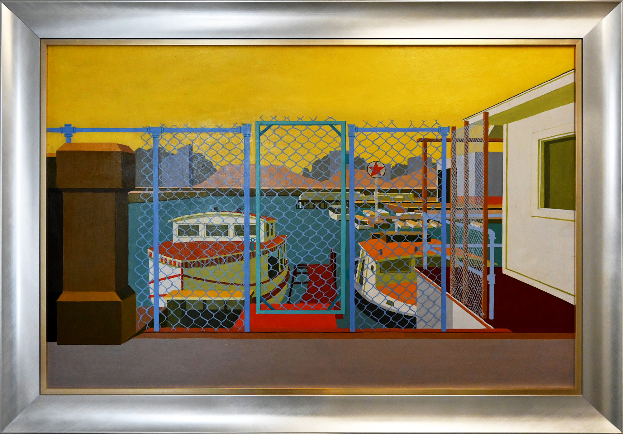 Celebrated Erie artist Joseph Plavcan was dedicated to the exploration of color in his art and often painted from life, capturing familiar scenes in the local community. This painting depicts two boats secured to a dock at a marina in Presque Isle Bay. The use of bold color and geometric landscapes are characteristic of Plavcan's work in the 1960s and 1970s.