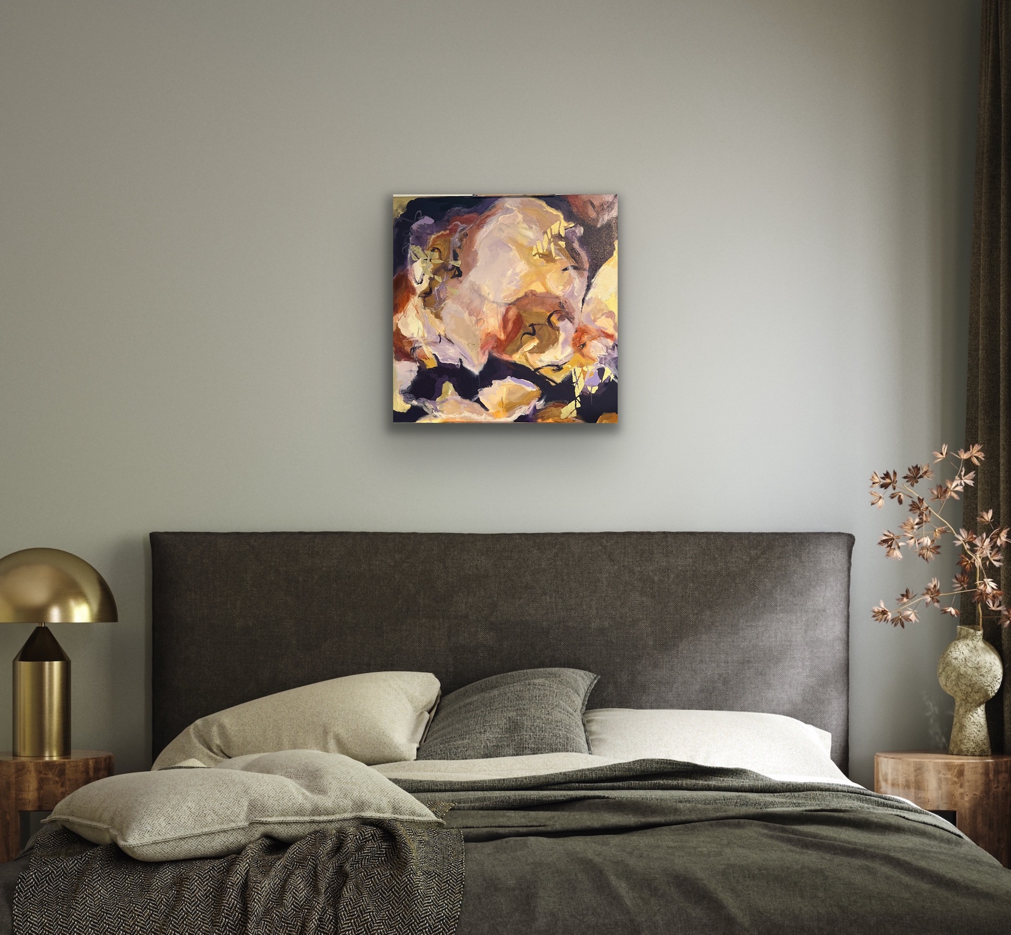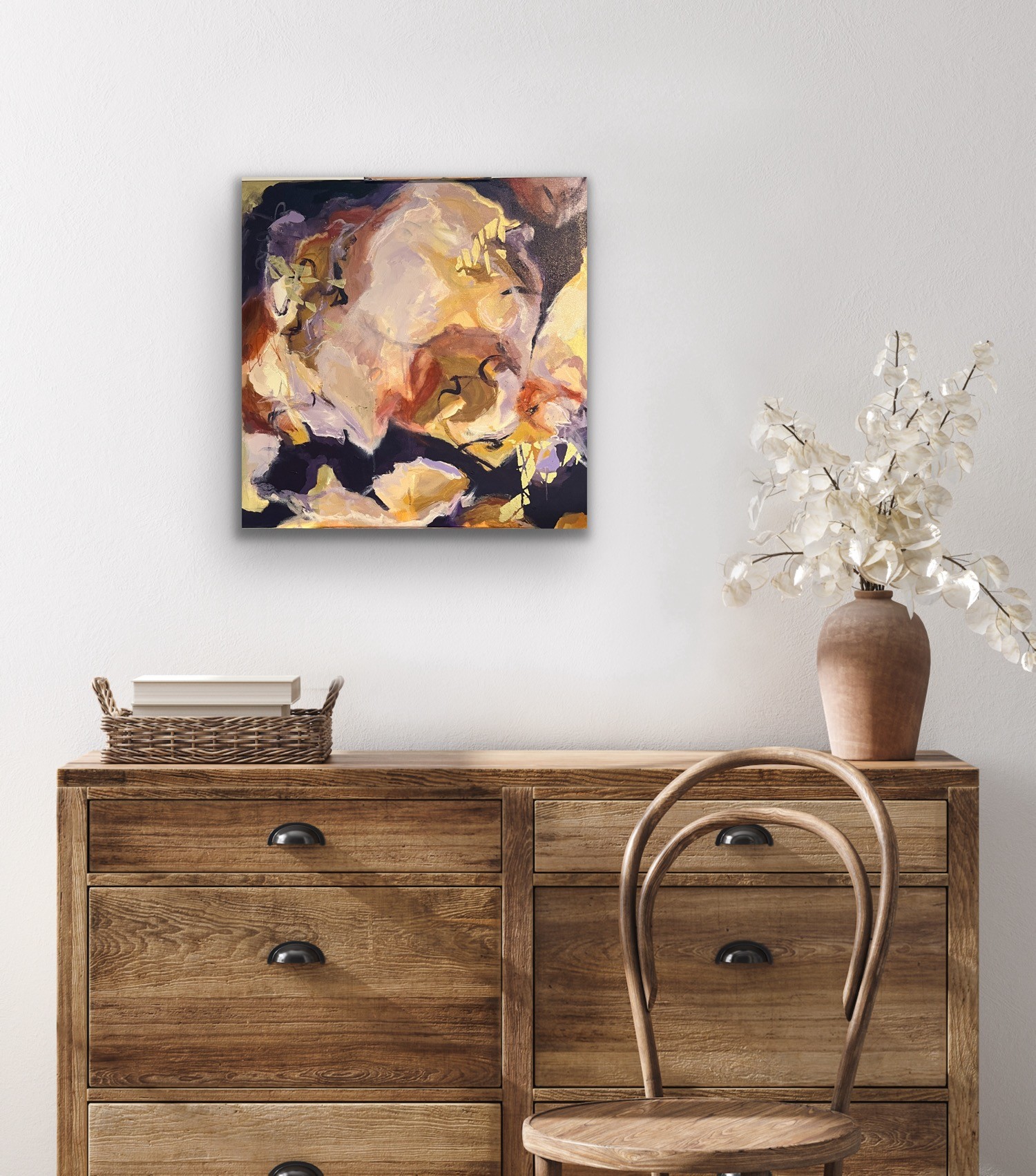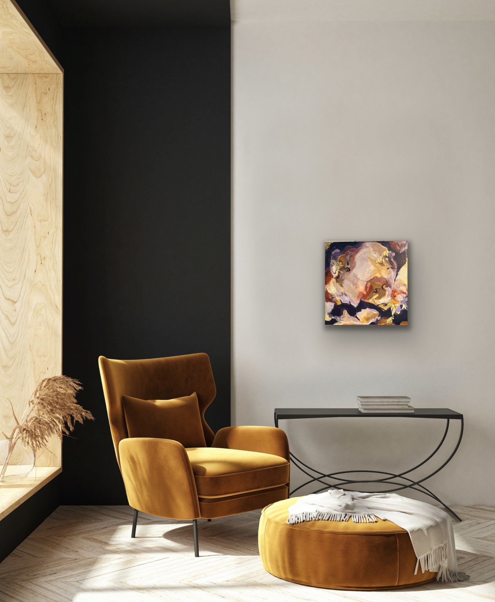 This piece was inspired by a friend's home in North Carolina. Her home is so warm and welcoming, and is full of rich wood and leather furniture, with beautifully curated art, books, and collectibles. I was moved to play with a warmer color palette than usual, and activated the canvas with the words "home sweet home."