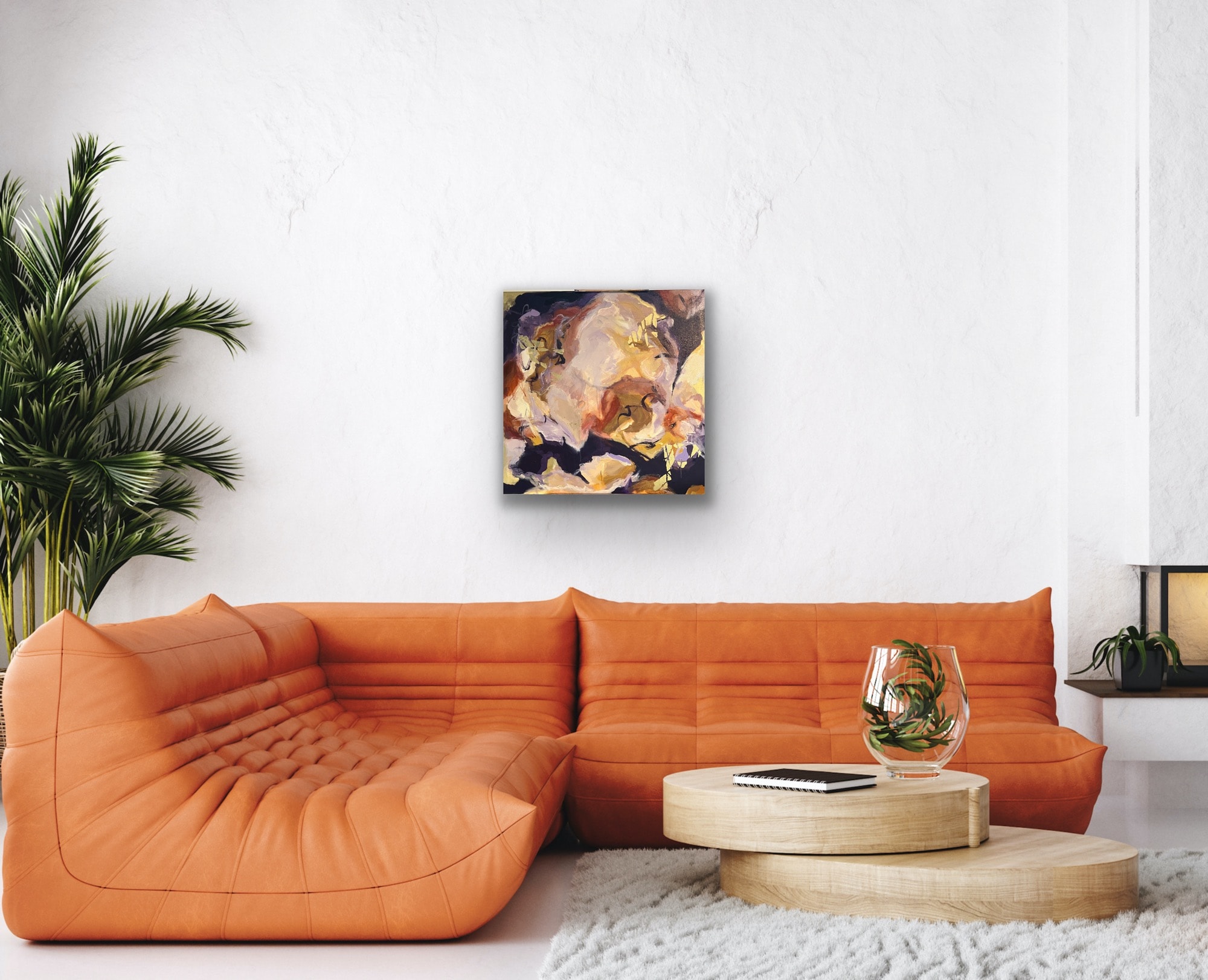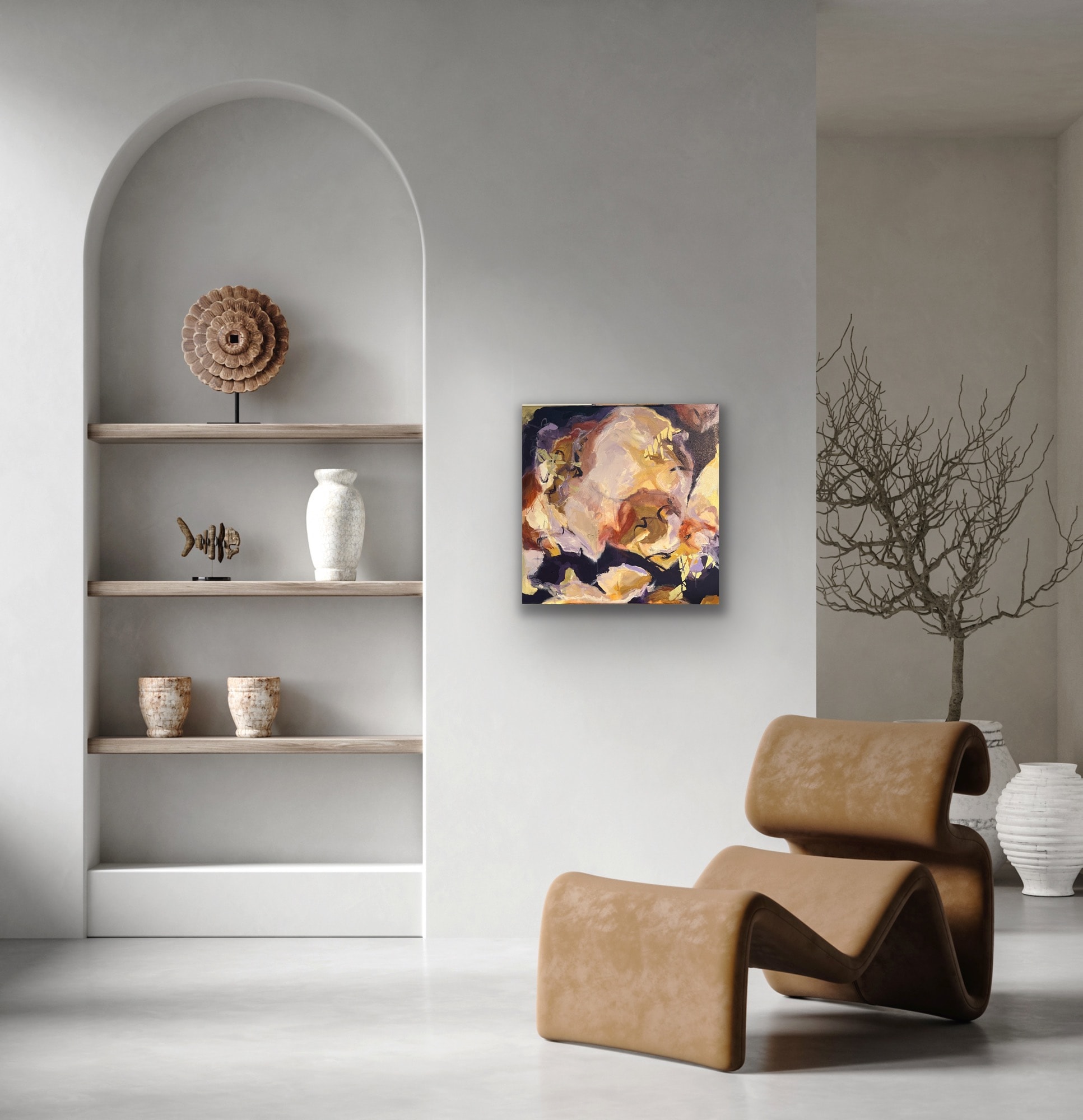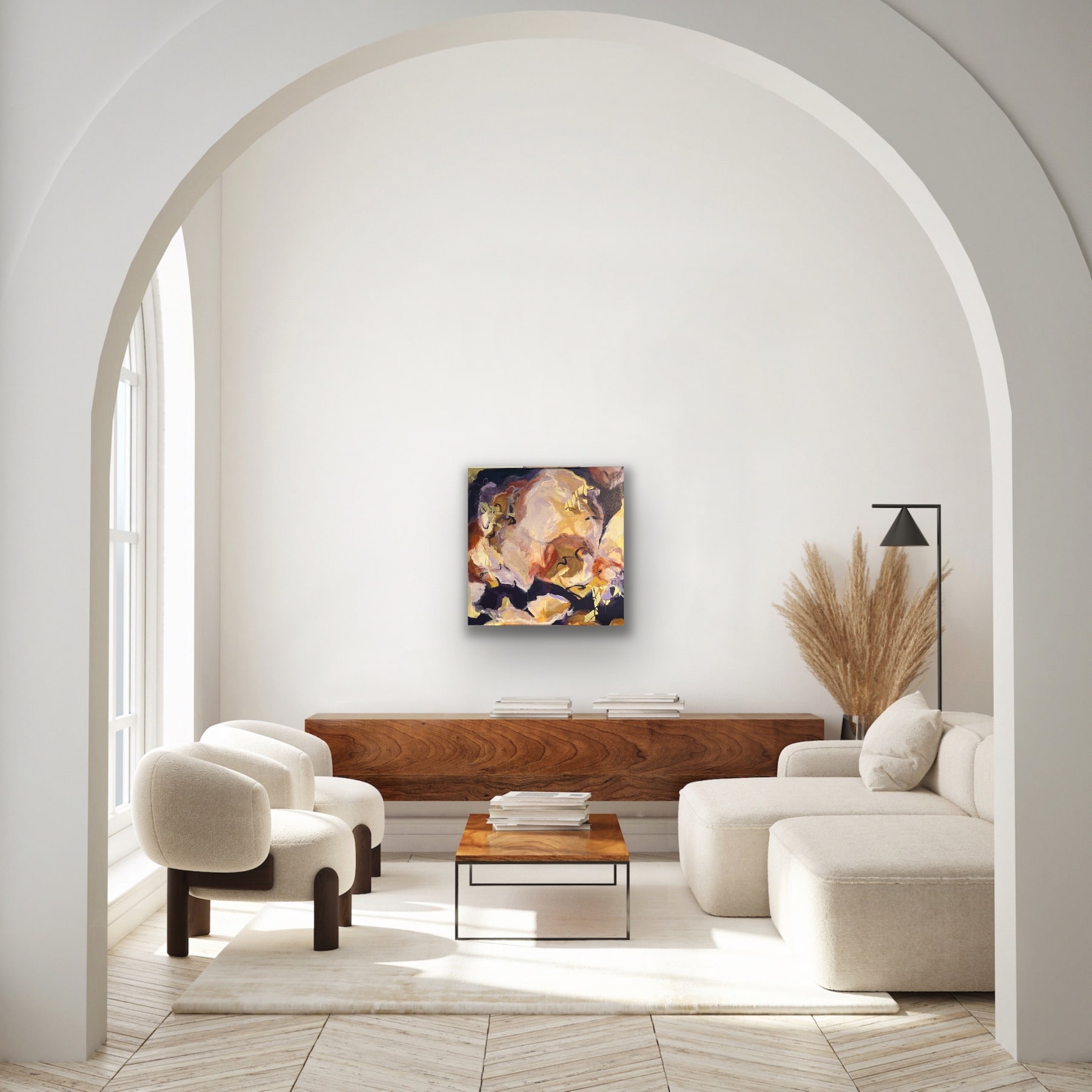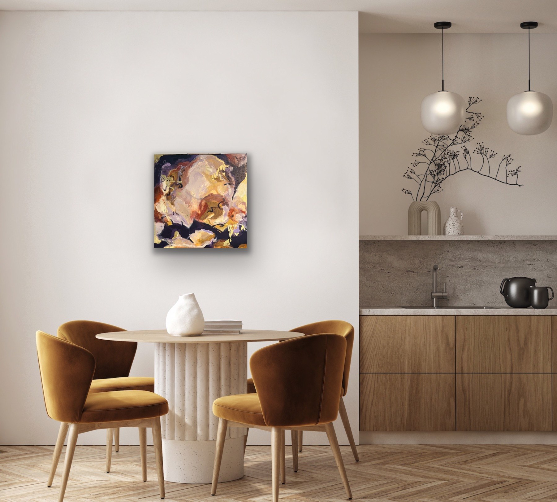 This piece was inspired by a friend's home in North Carolina. Her home is so warm and welcoming, and is full of rich wood and leather furniture, with beautifully curated art, books, and collectibles. I was moved to play with a warmer color palette than usual, and activated the canvas with the words "home sweet home."