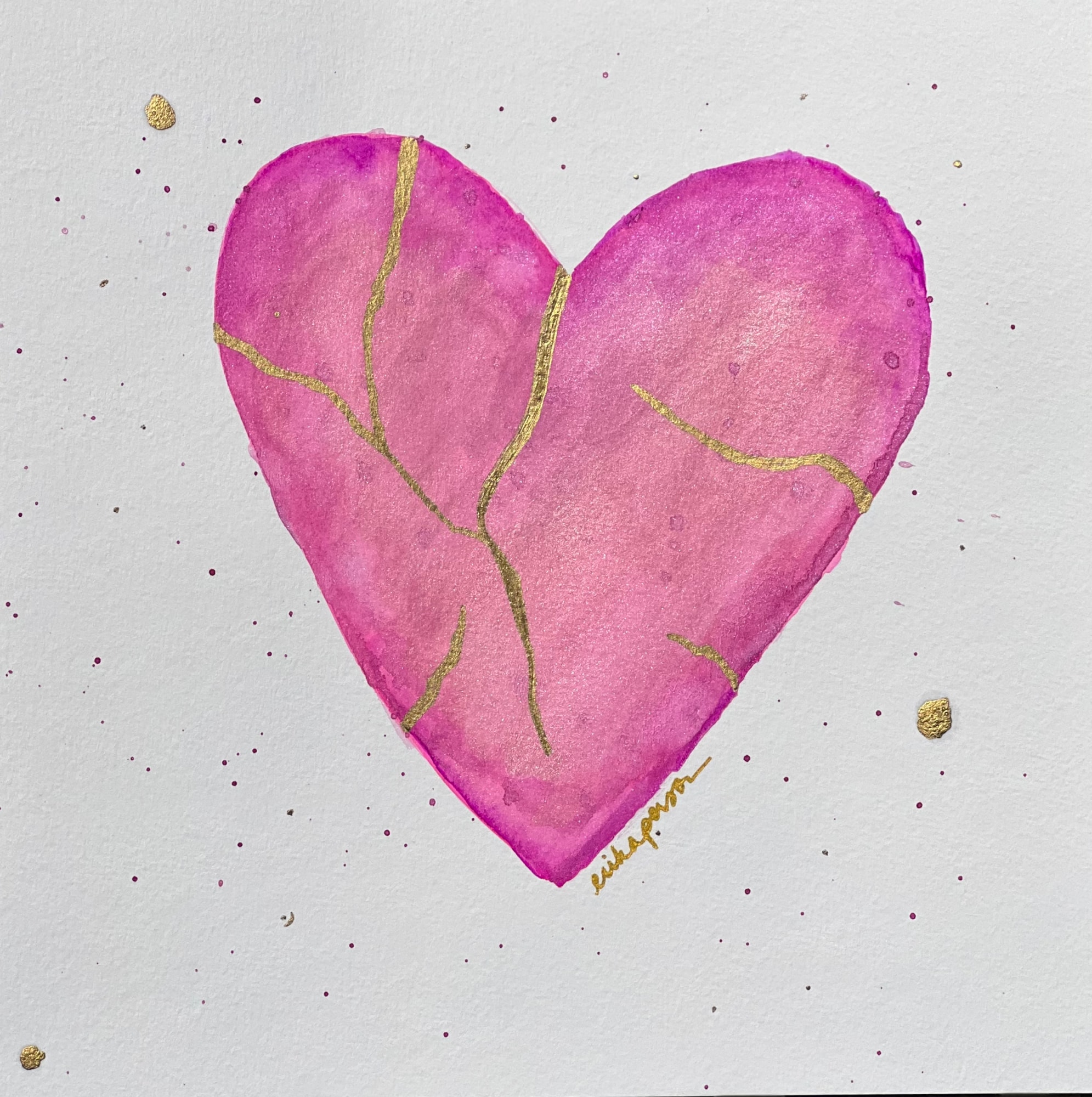 This is part of my kintsugi-inspired Healing Hearts series. Watercolor (translucent and metallic) and gouache on cold press paper, with reflective gold acrylic ink.