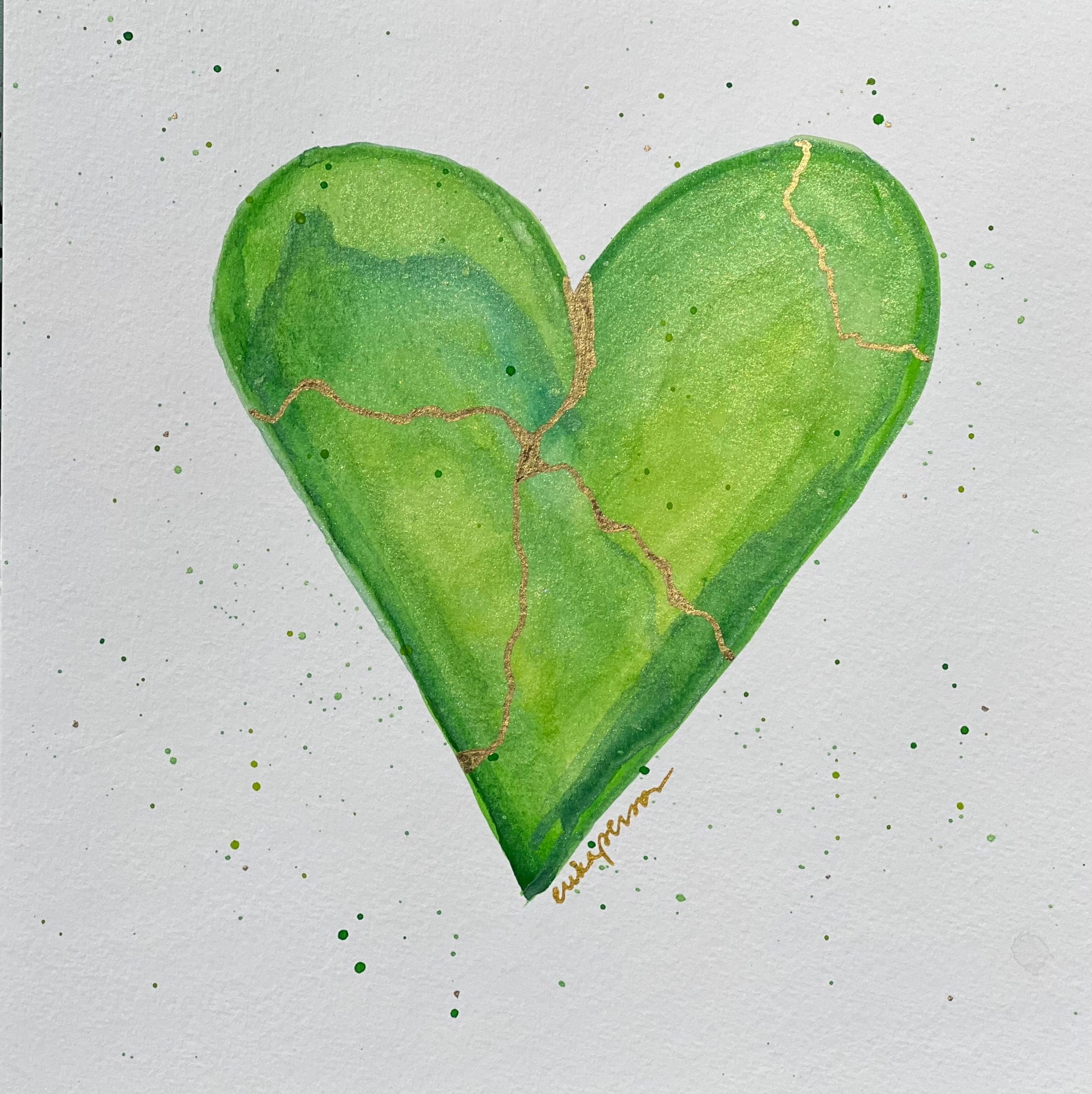 This is part of my kintsugi-inspired Healing Hearts series. Watercolor (translucent and metallic) and gouache on cold press paper, with reflective gold acrylic ink.