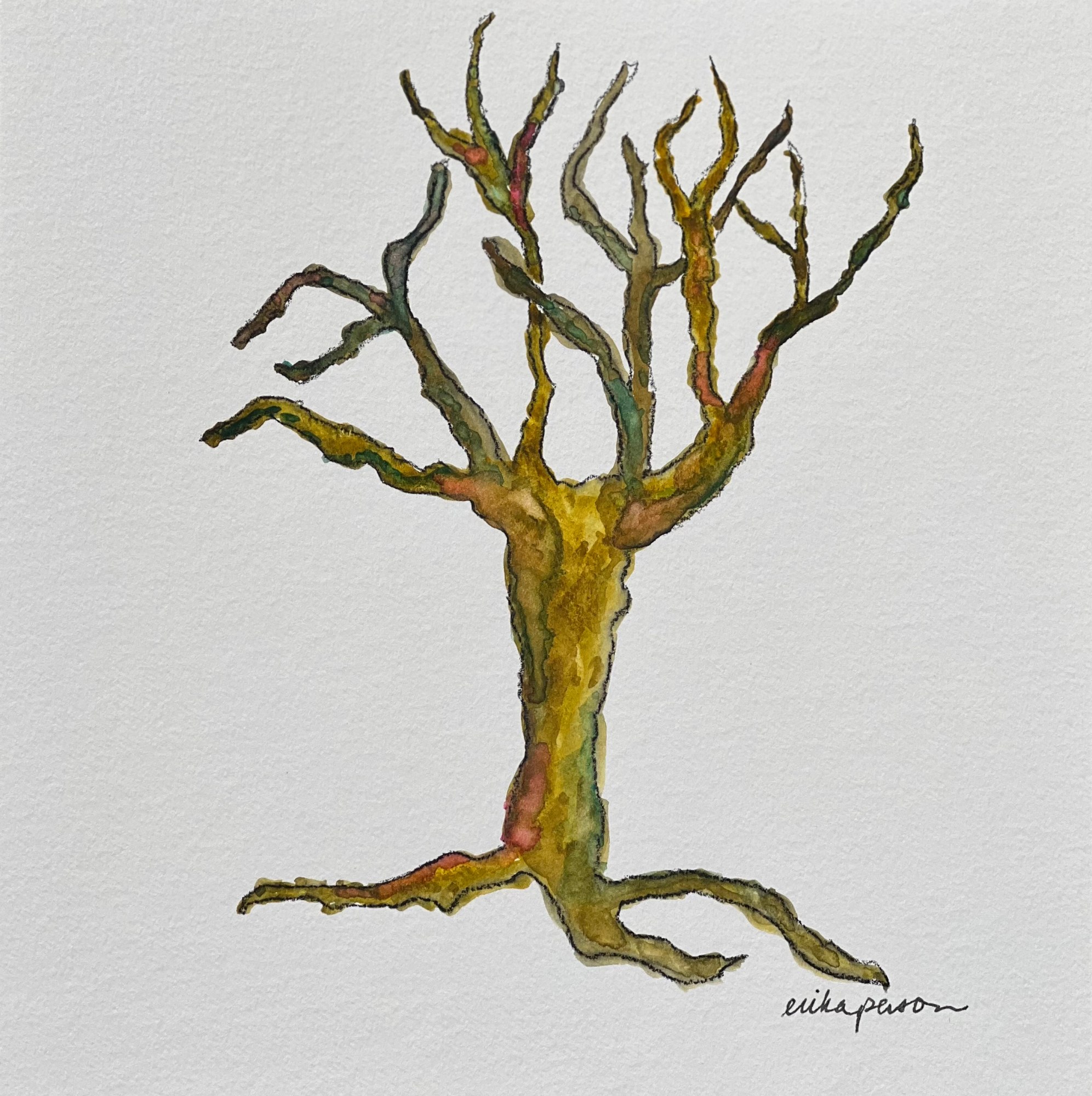 This is part of my Little Trees series. Watercolor and stabilo pencil on cold press paper, signed in ink.