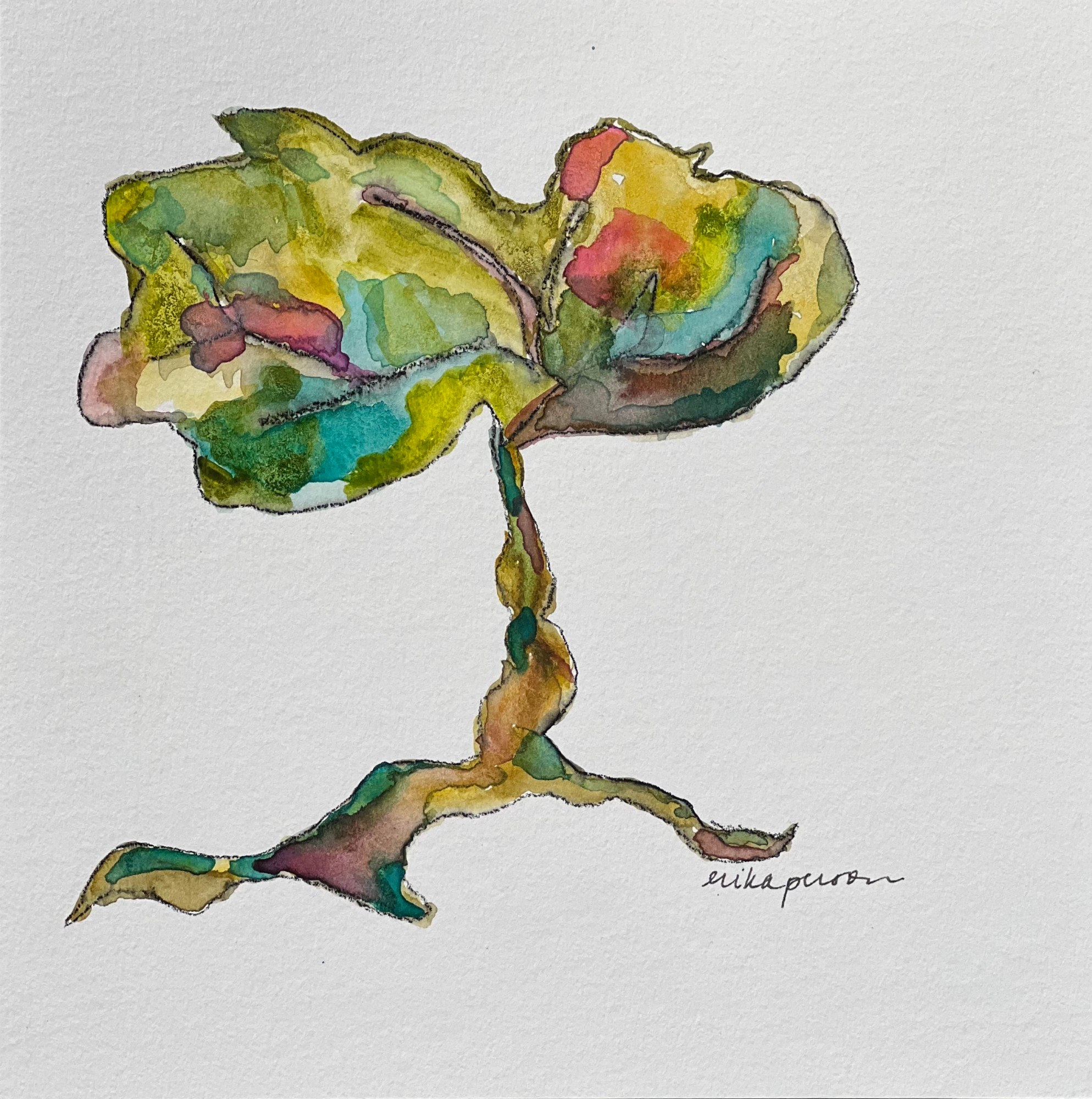 This is part of my Little Trees series from 2023, inspired by the song of the same name. Watercolor and stabilo pencil on cold press paper, signed in ink.