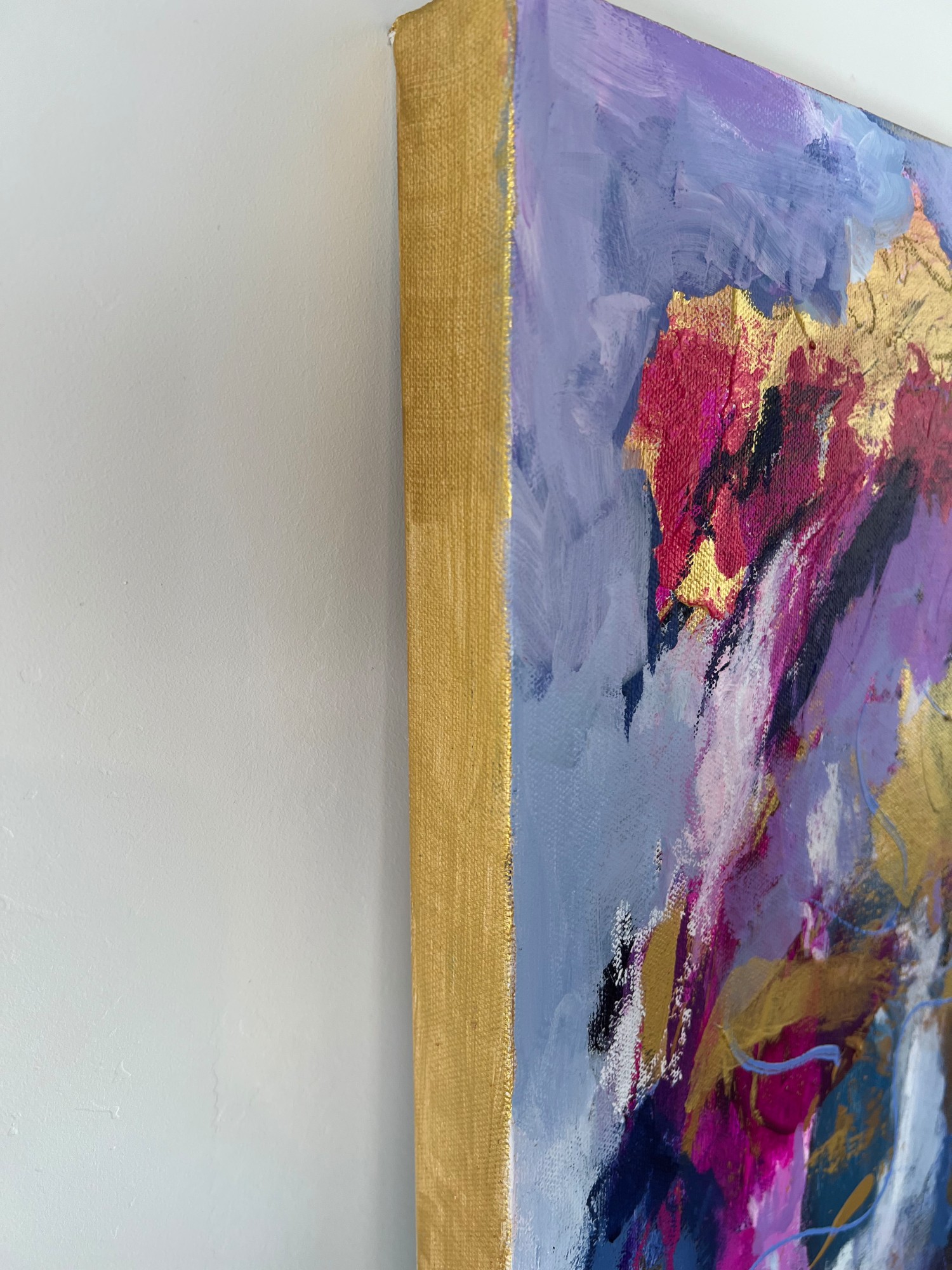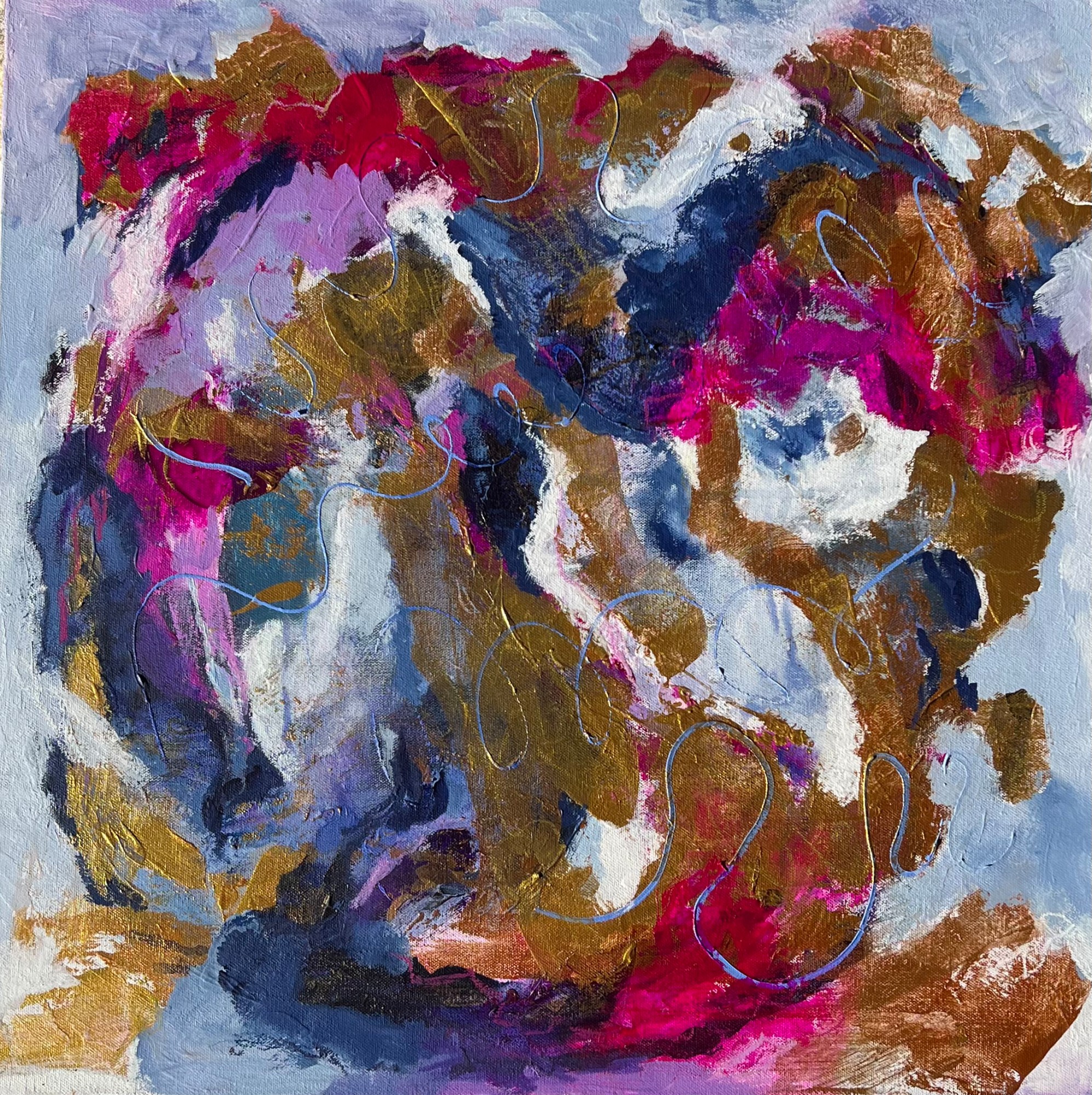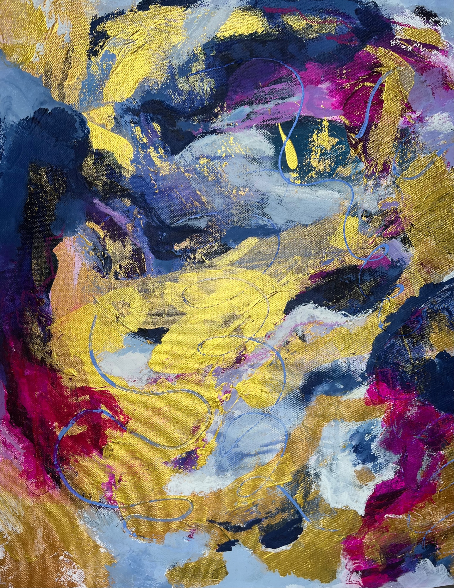 I'd planned to start painting to "It's a Kind of Magic" by Queen, but due to some technical difficulties, I wasn't able to start until "The Show Must Go On," which has a very different energy! The title lyric performed double-duty as the energetic inspiration and the first marks on the canvas. This 24x24" piece packs a dramatic punch, with fluorescent magenta and three shades of gold!