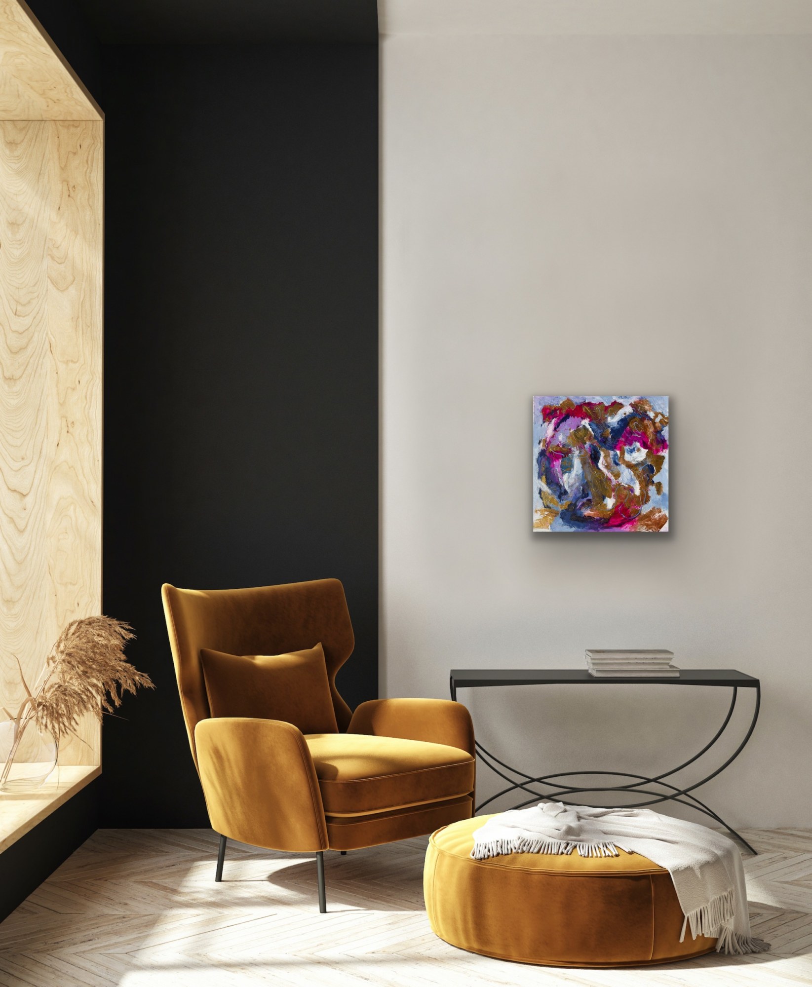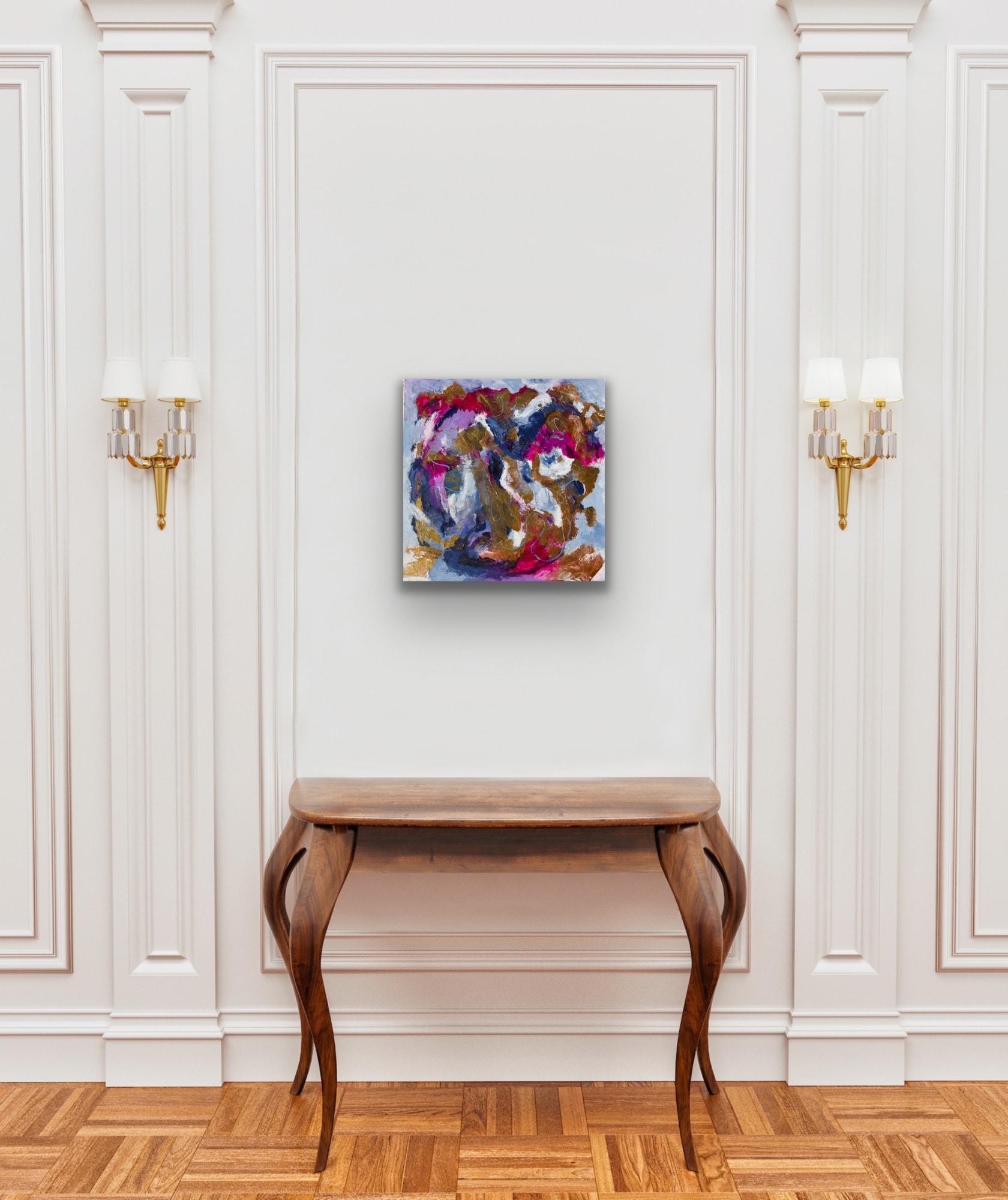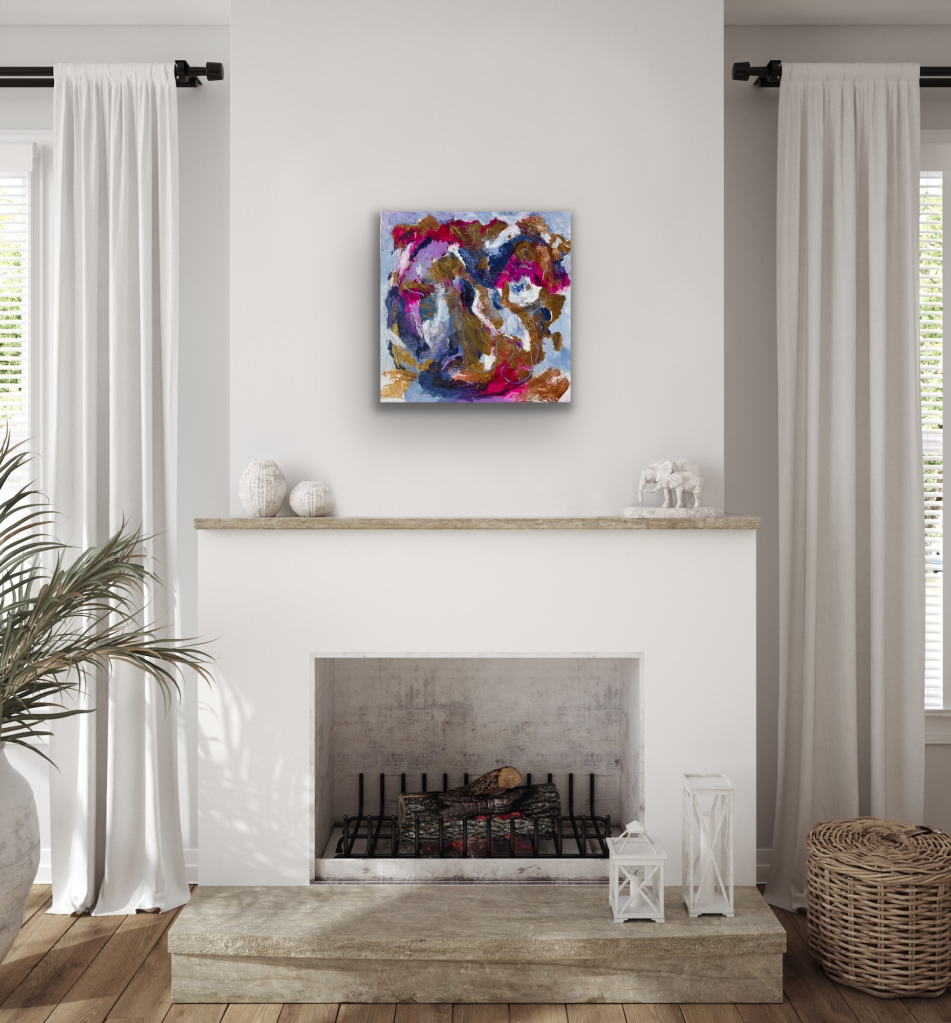 I'd planned to start painting to "It's a Kind of Magic" by Queen, but due to some technical difficulties, I wasn't able to start until "The Show Must Go On," which has a very different energy! The title lyric performed double-duty as the energetic inspiration and the first marks on the canvas. This 24x24" piece packs a dramatic punch, with fluorescent magenta and three shades of gold!