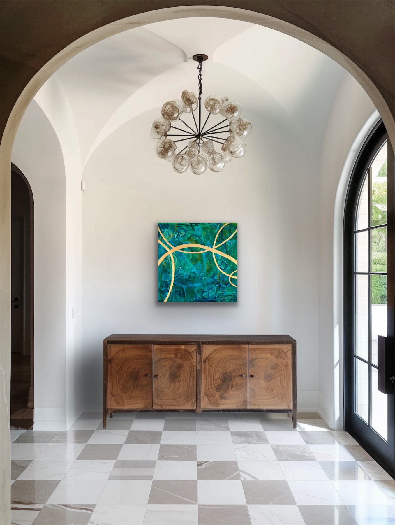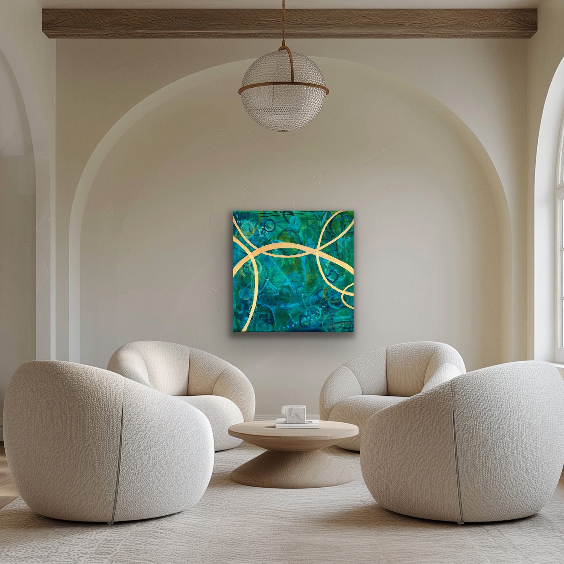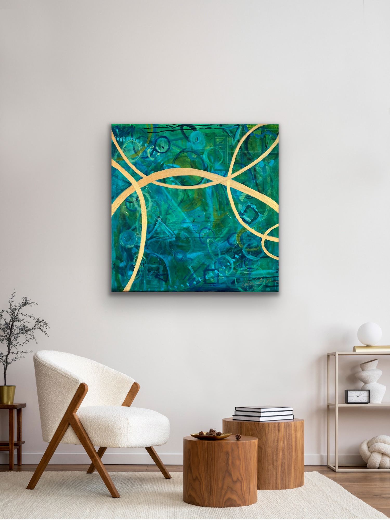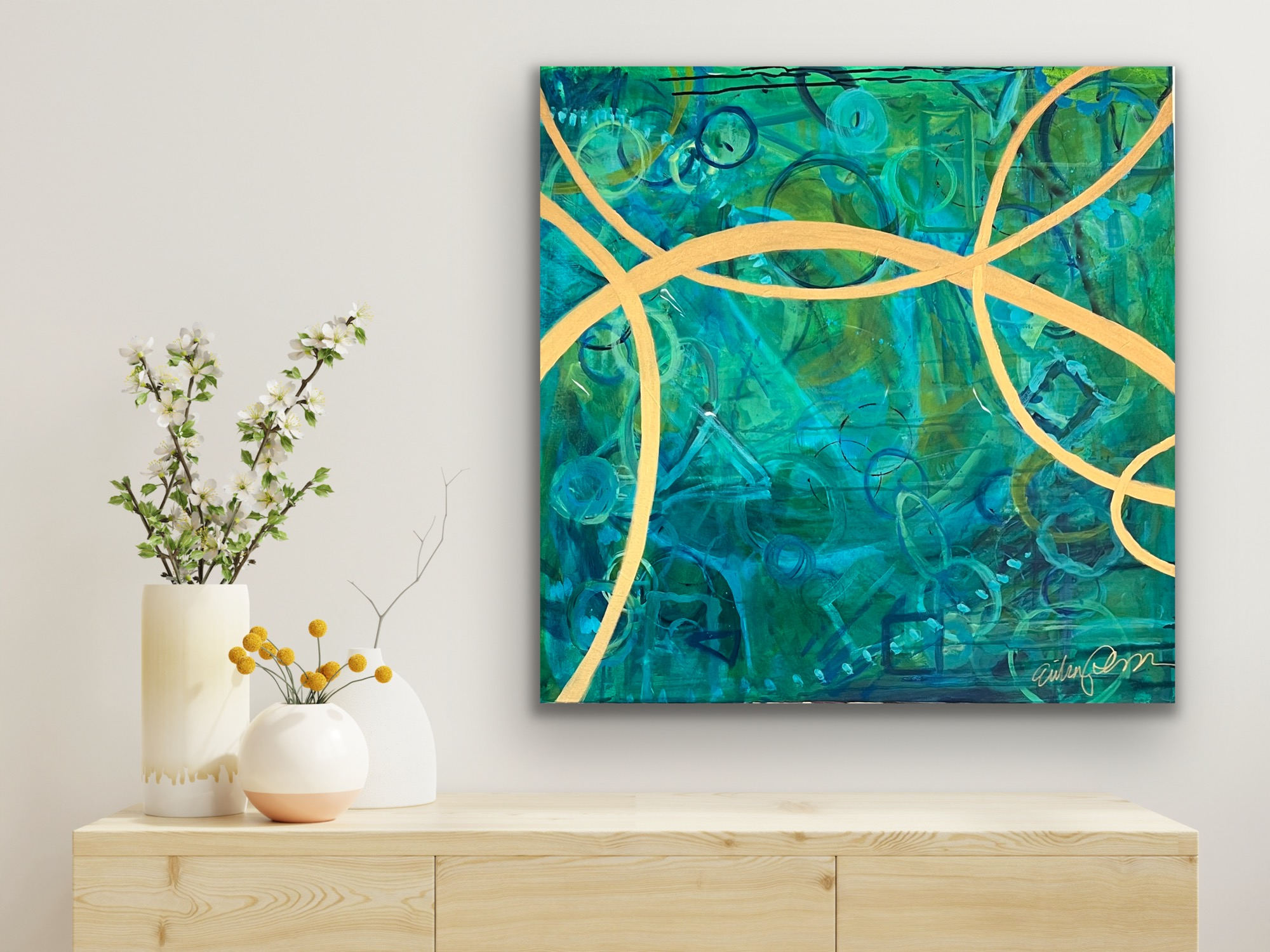 We Are All Connected was commissioned by Deanna Mayer and inspired by The Helix School in San Rafael. Their motto, “Guiding autistic children to lead fulfilling and connected lives,” appears in the painting’s base layer. Their logo, a hummingbird, and the school’s name also appear in the middle layers.