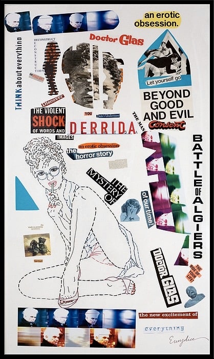 Eurydice: Beyond Good and Evil (The Battle of Algiers with the French philosopher Jacques Derrida), 50”x86”, hand-stitched collage of original film posters, & photos on museum quality paper. Professionally framed in museum white.