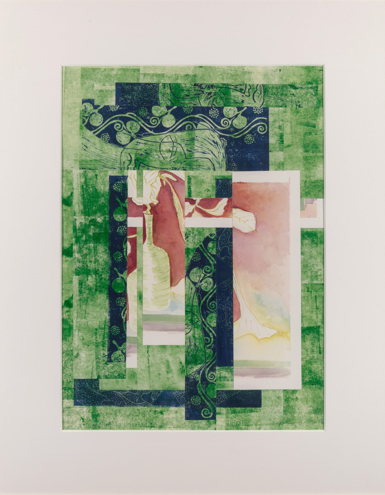 Linocut, watercolor and brushed ink on paper