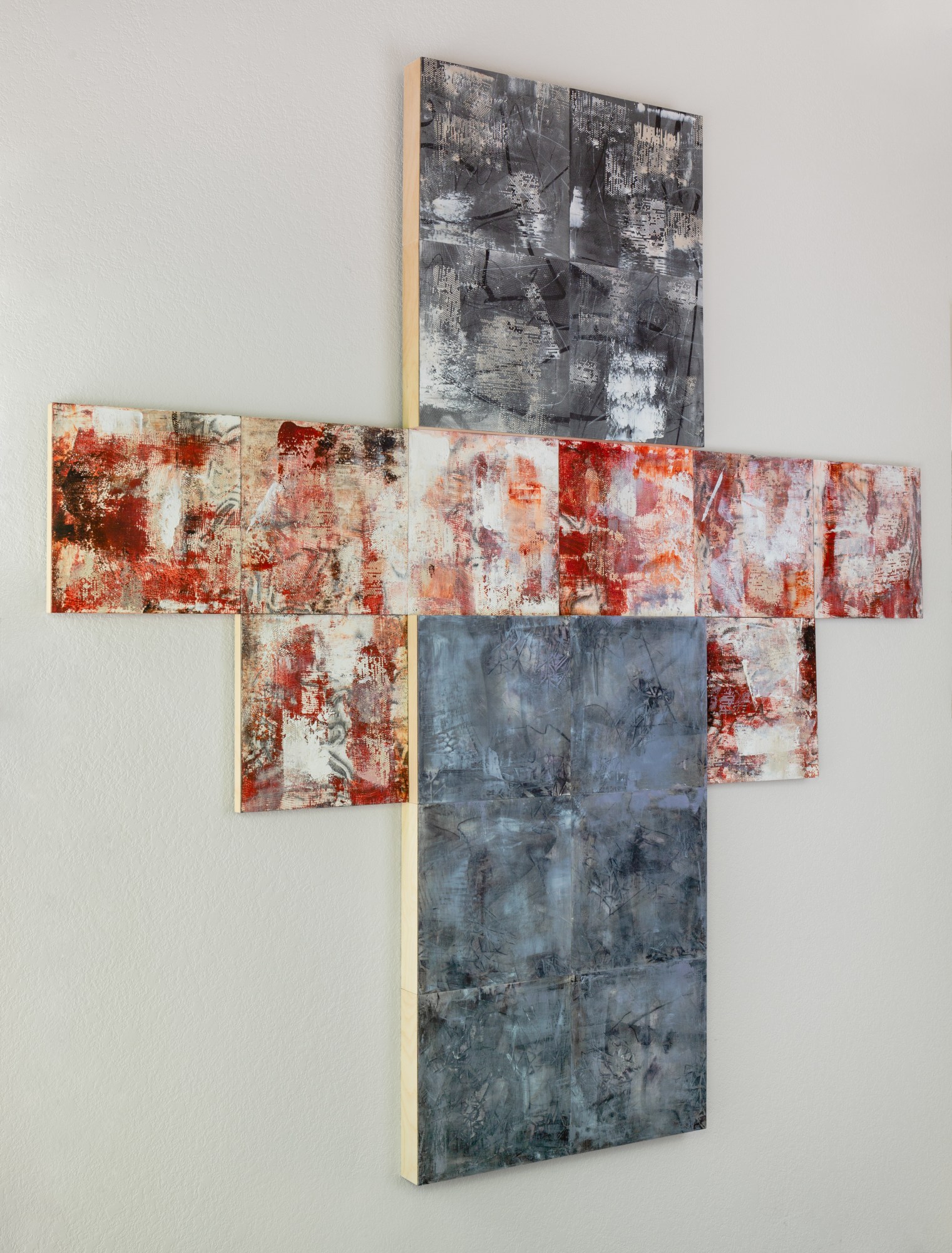 Oil and cold wax on eighteen joined wood panels with rubbings and pochoir