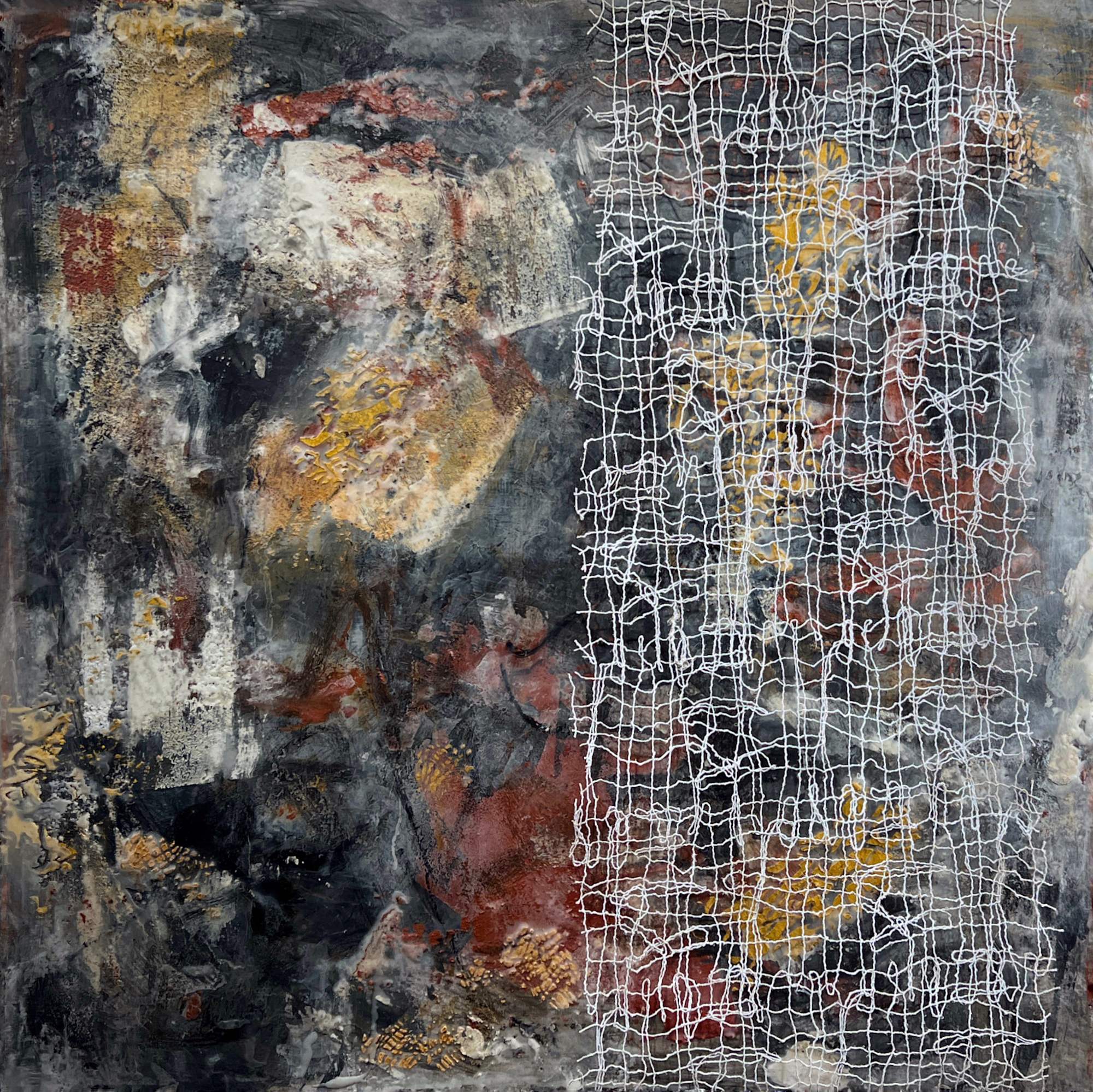 Venetian plaster, encaustic and Turkish textile on wood panel