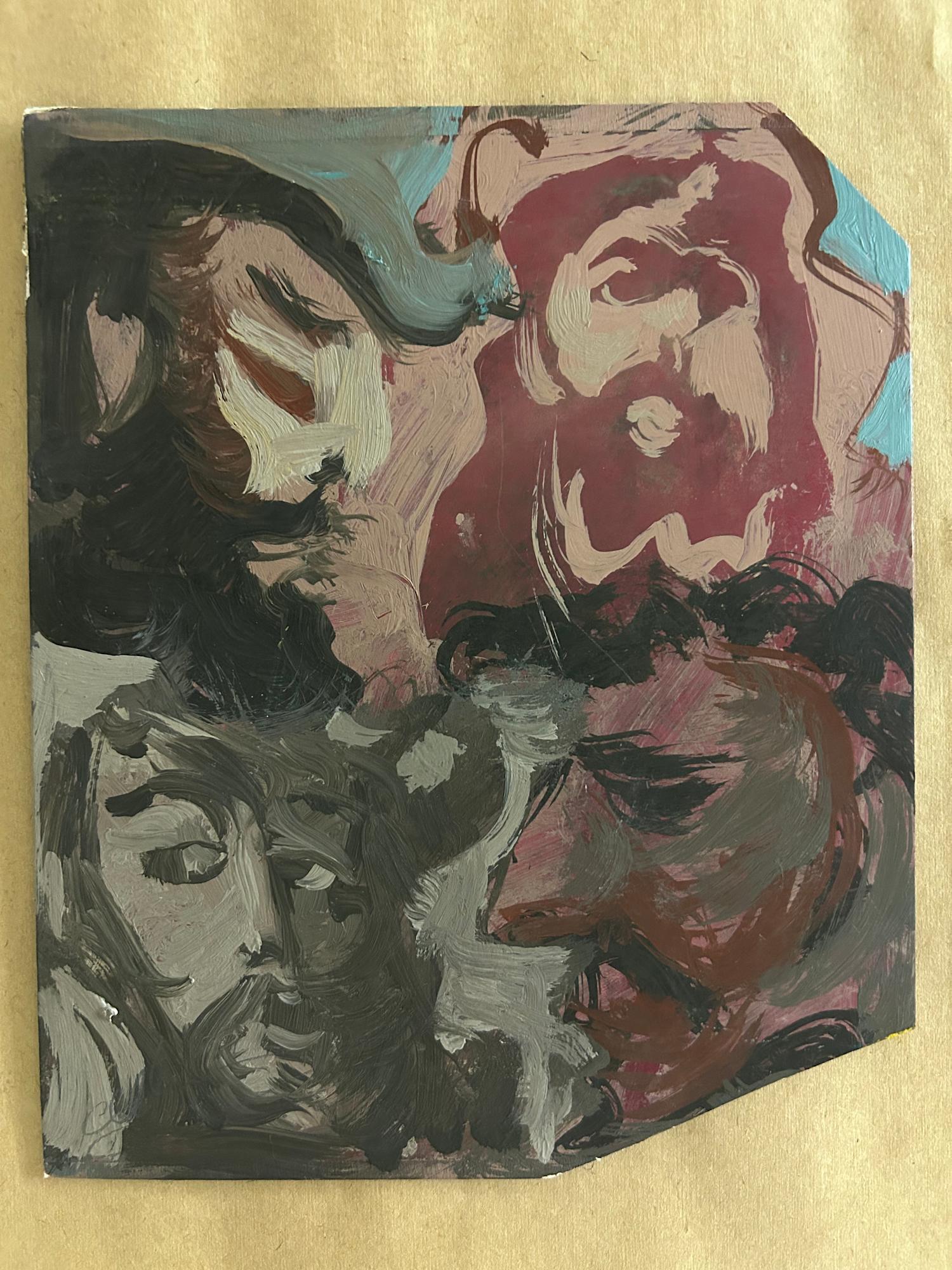 Self Portrait of Artist. Part of the Artine Artinian Collection of Florida Artists. A four-piece portrait by Harvey Parks (aka Cellini). It is not clear if there were four different subjects or if some of the subjects are painted more than once. The four faces blend into each other with bold, swirling brushstrokes. The face on the top left is the most abstracted of the four.