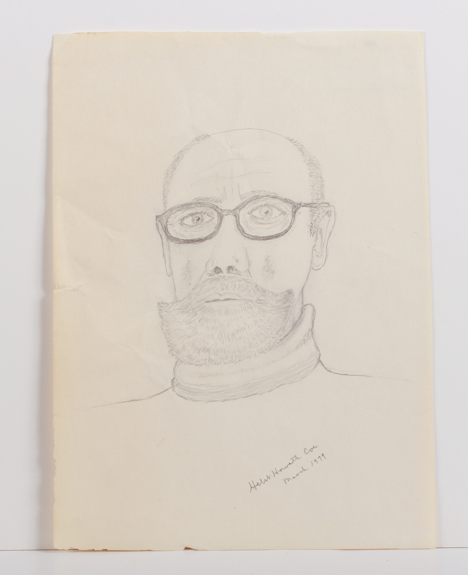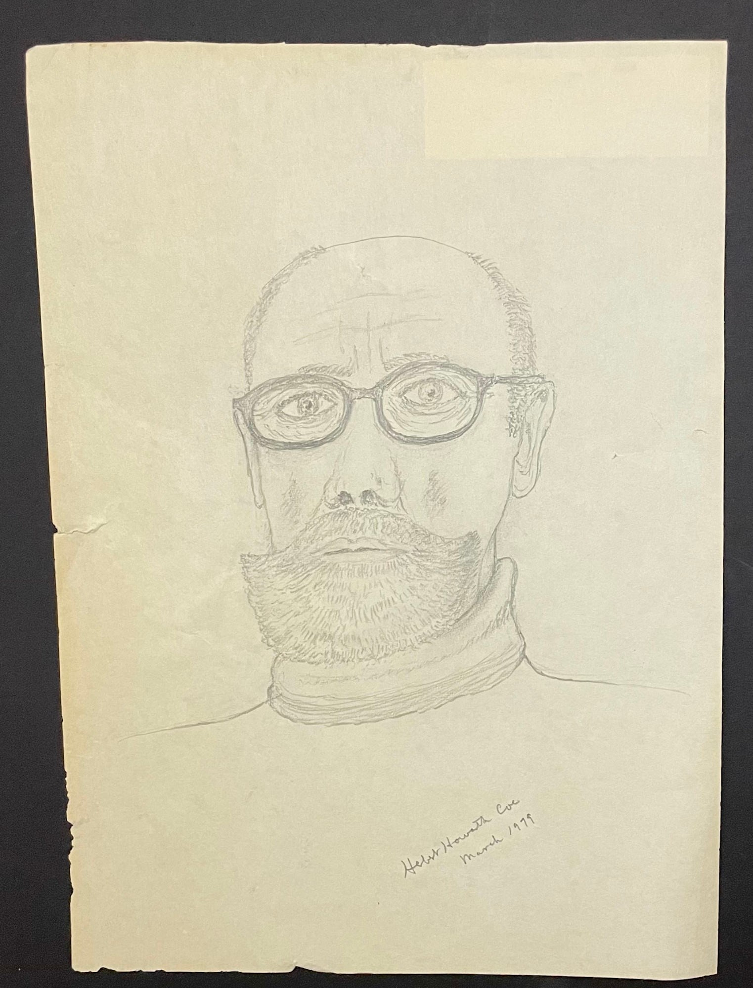 Part of the Artine Artinian Collection of Florida Artists. This self-portrait by Herbert Coe is a detailed pencil drawing on paper, showcasing the artist’s likeness. Coe is depicted wearing glasses and a turtleneck. The artist uses pencil shading effectively to create depth and dimension, with subtle gradations of light and dark that bring the portrait to life. At the bottom of the piece, the inscription reads, "Herbert Howard Coe March 1979."