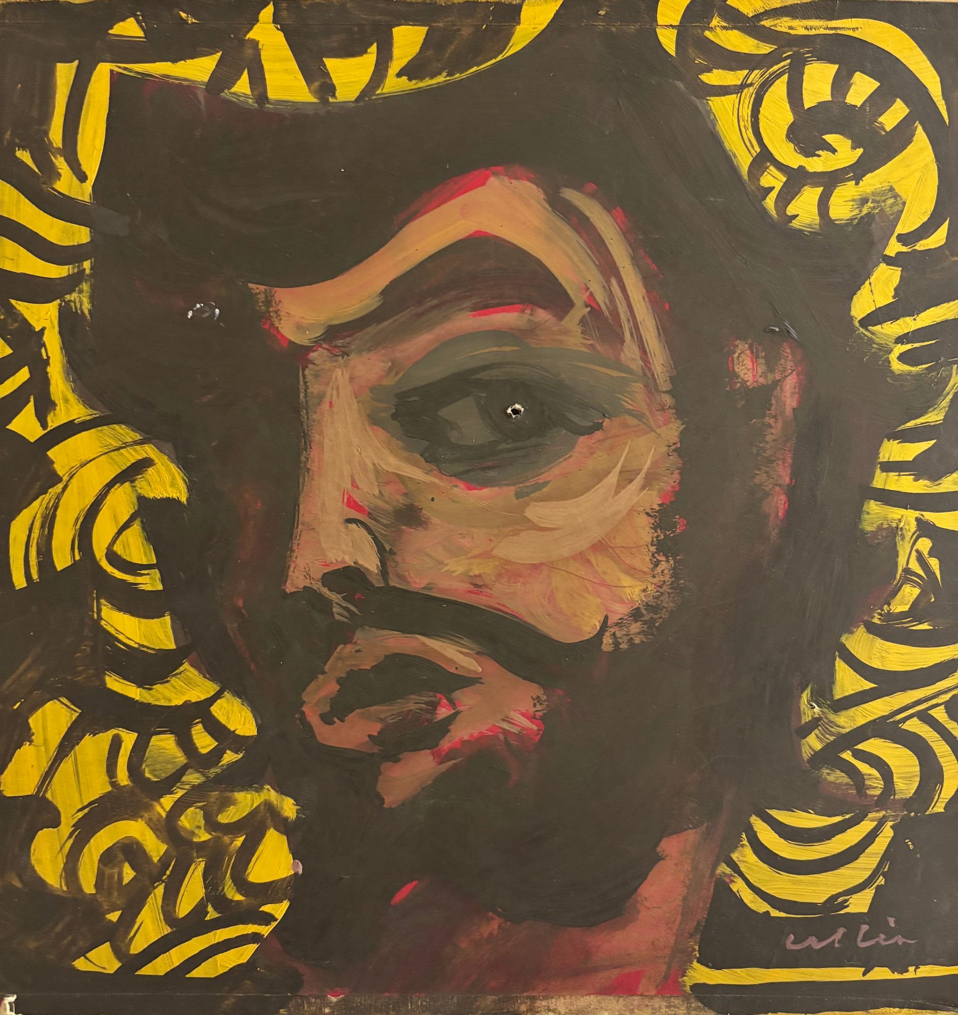 A captivating oil painting blending expressive realism with bold stylization. The subject's intense gaze and dynamic brushstrokes bring personality and movement to the piece, making it a striking character study.