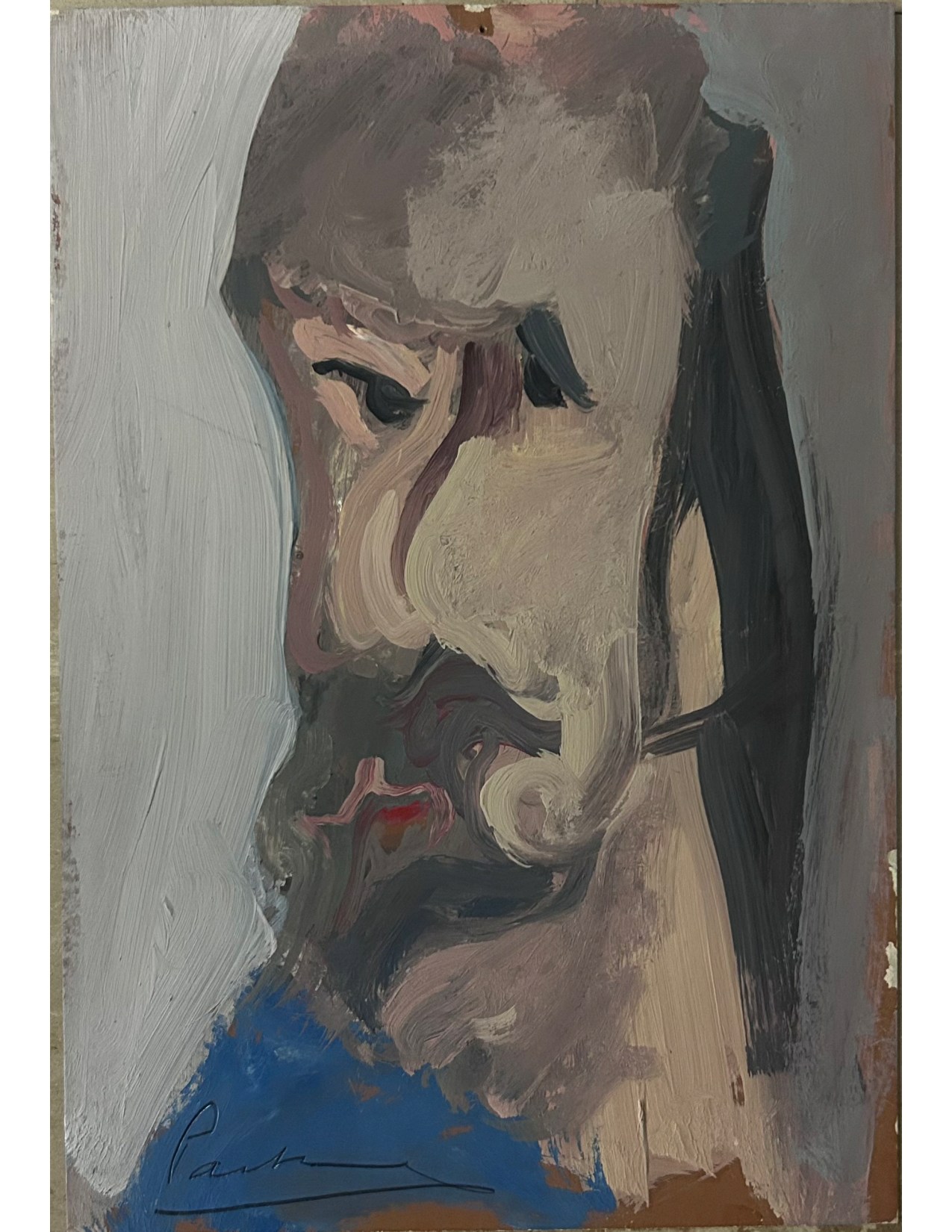 An abstract figurative self-portrait that presents a dynamic composition, exploring the relationship between geometric shapes and bold color contrasts. The artist's use of smooth brushwork, paired with texture-enhancing techniques, adds tactile depth to the piece, inviting viewers to engage with its emotional and visual resonance.
