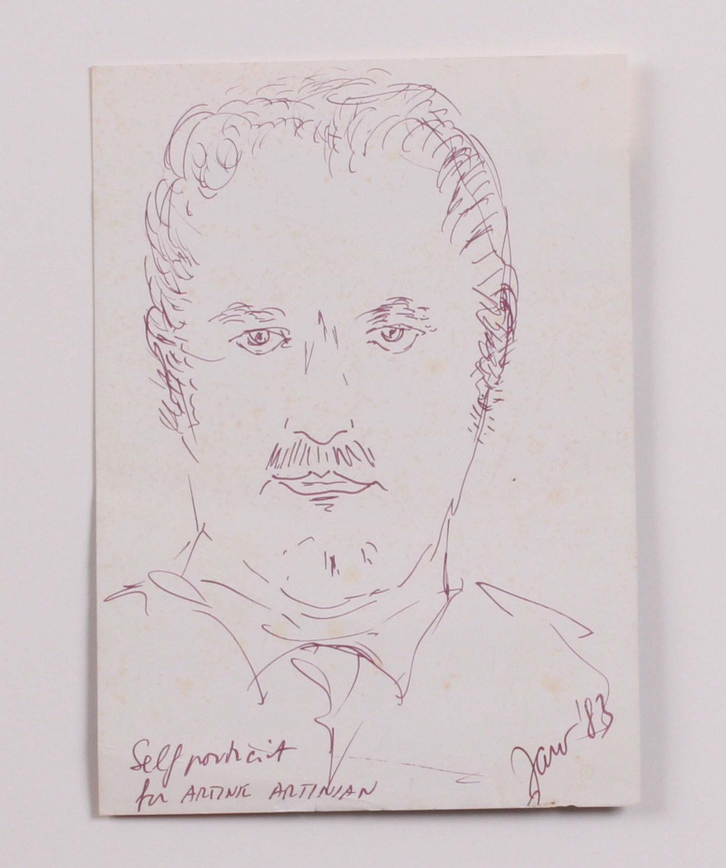 This is a figurative self-portrait by Jaro. He uses quick, small lines to articulate the facial features, clothing, and hair. This portrait is from the head to the shoulders. He also uses one color for his ink.