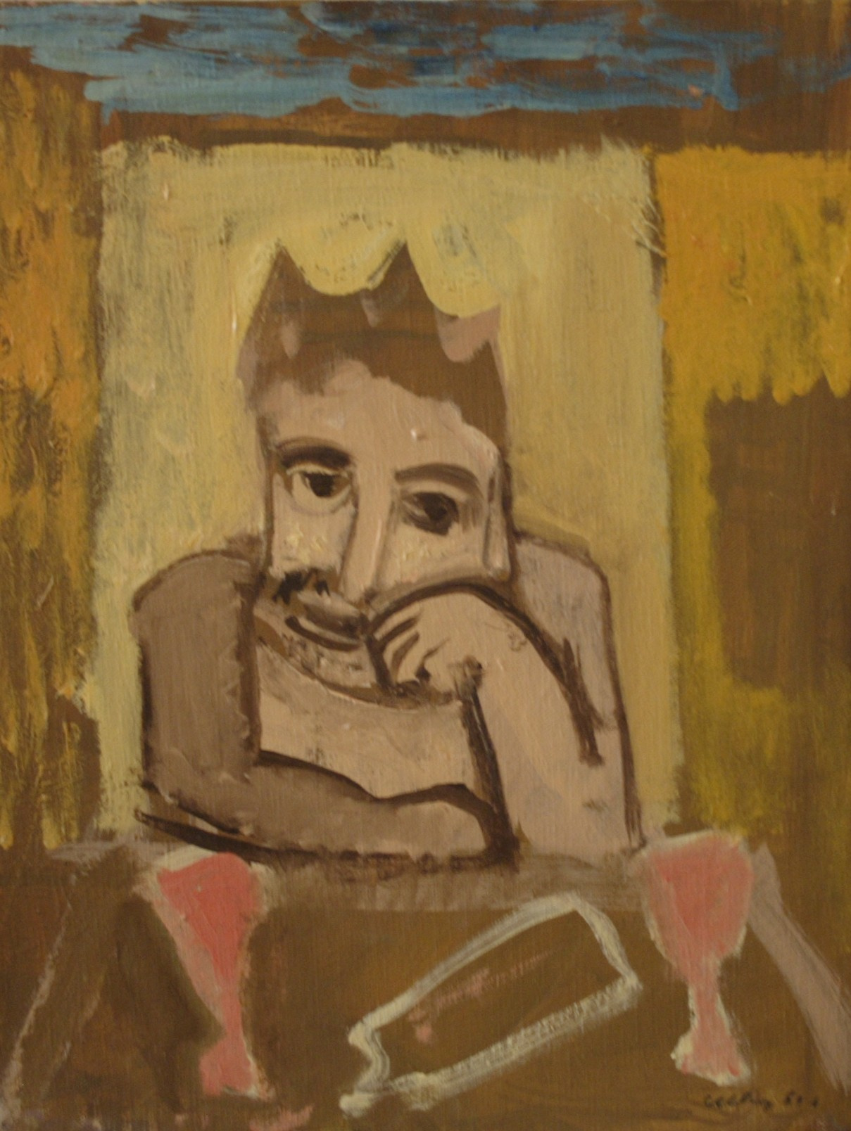 This abstract figurative self-portrait by Cellini features a glimpse into the artist's perception of himself. Done mainly in earth tones of brown, the pops of blue, red, and gold add interest and draw the viewer's eyes around the work.