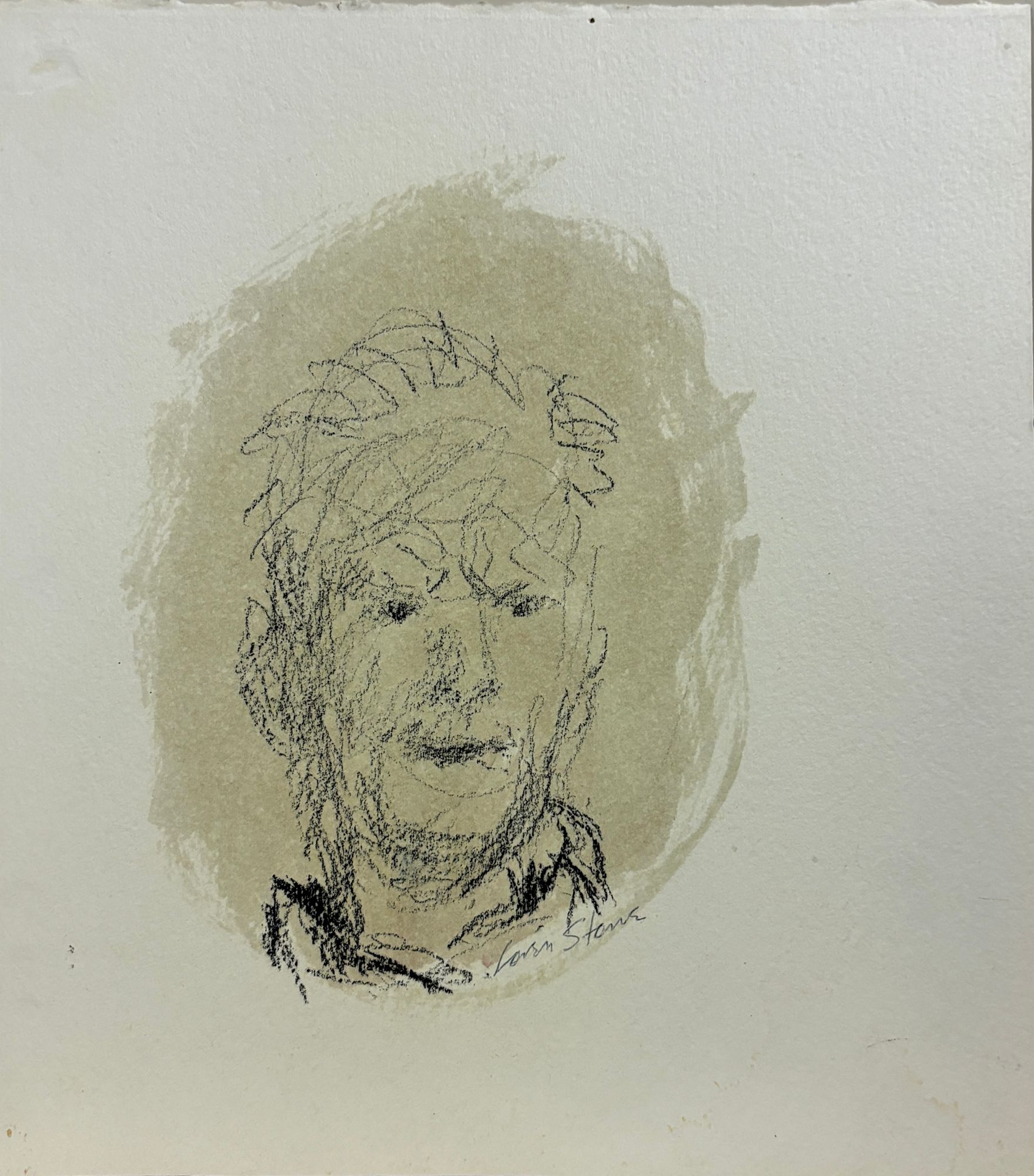 Self Portrait of Artist. Part of the Artine Artinian Collection of Florida Artists. This work is a mixed media piece by Loren Stone. The piece depicts a man using complex markmaking. Stone uses a layering of marks to create movement and express emotion in the face of the man with the addition of simple color and shape in the background.
