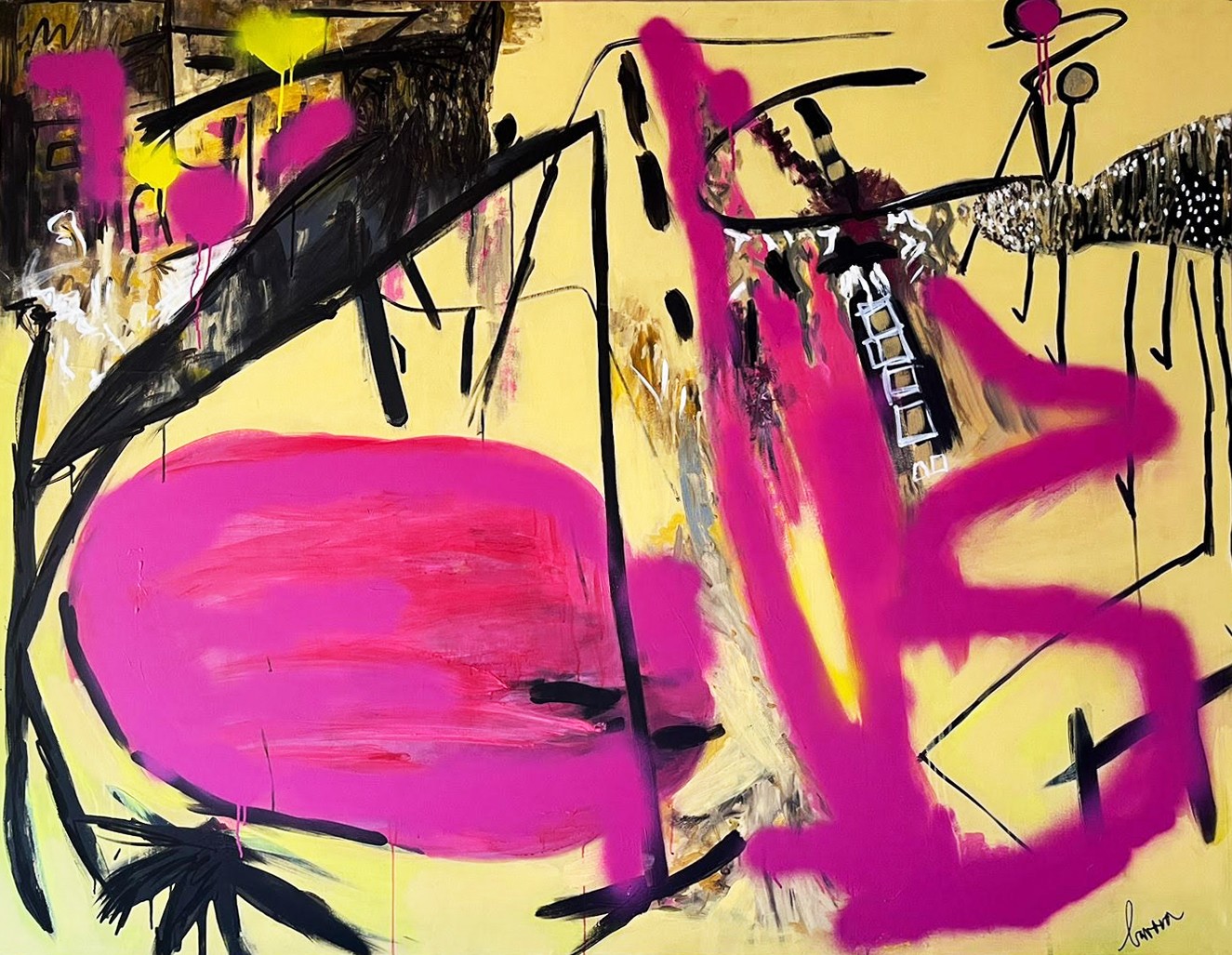 Fuchsia acrylics bring its wings to life, while a sand-colored background sharpens the presence of black insects, anchoring the moment in contrast and quiet wonder.