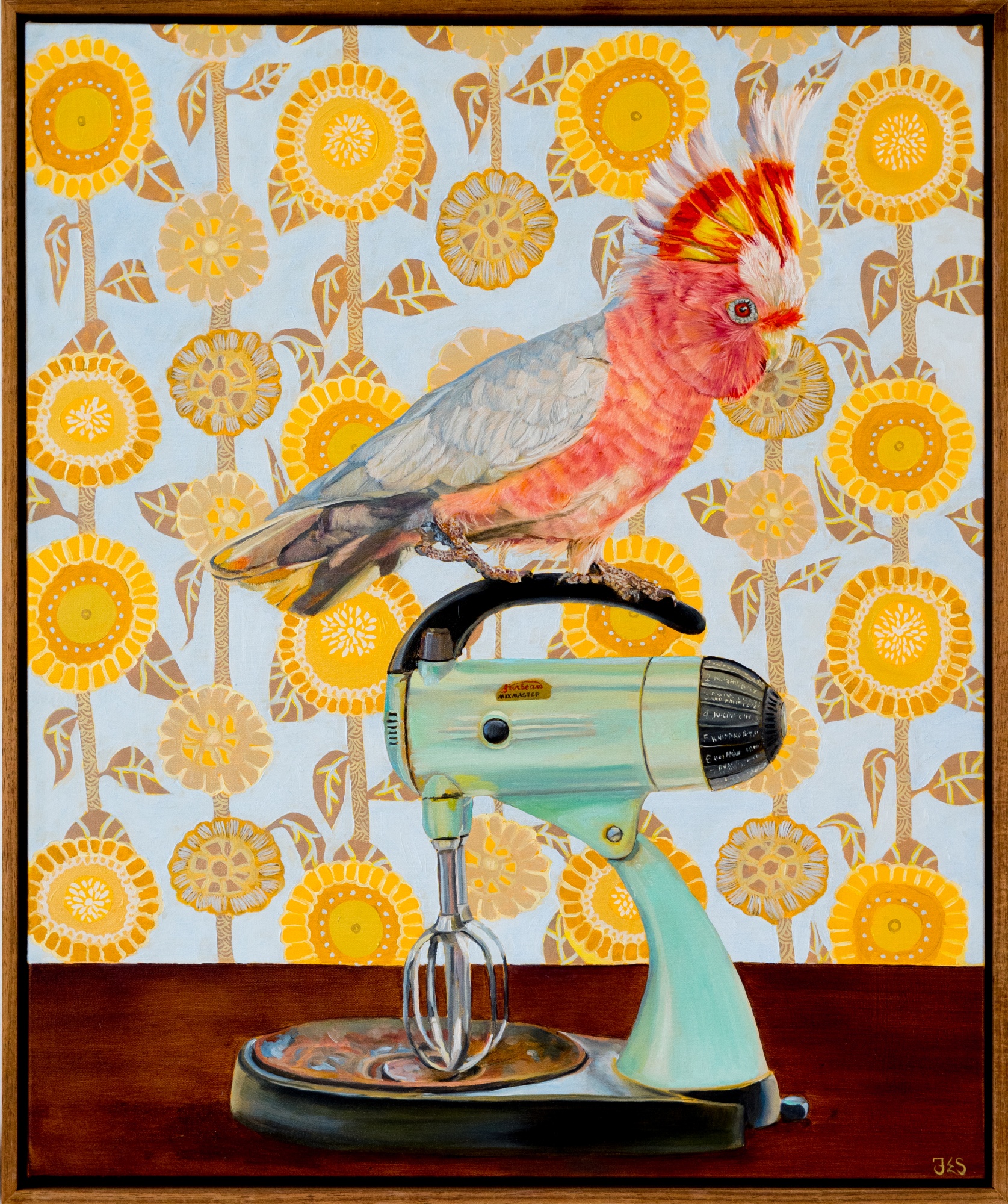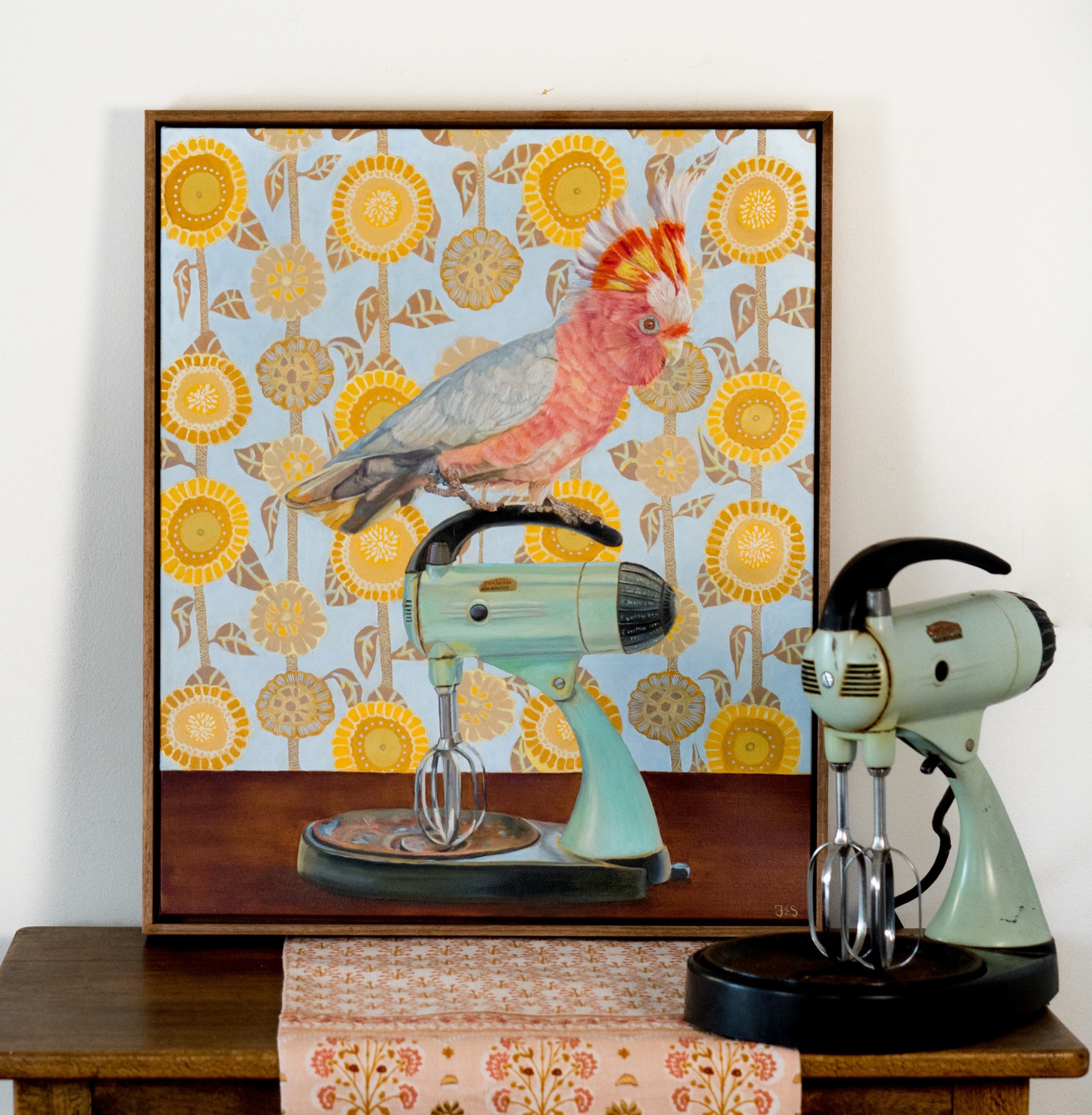 This is a wonderful Pink Cockatoo, astride a 1940s model 7 Sunbeam Mixmaster - just like the one my mother used to make my favourite chocolate cake. The bird is an Australian favourite, previously known as a Major Mitchell. The name was changed in recognition that Sir Thomas Mitchell, the surveyor general of New South Wales from 1828 to 1855, was in fact responsible for a massacre of indigenous Kureinji and Barkindji people on the banks of the Murray River.