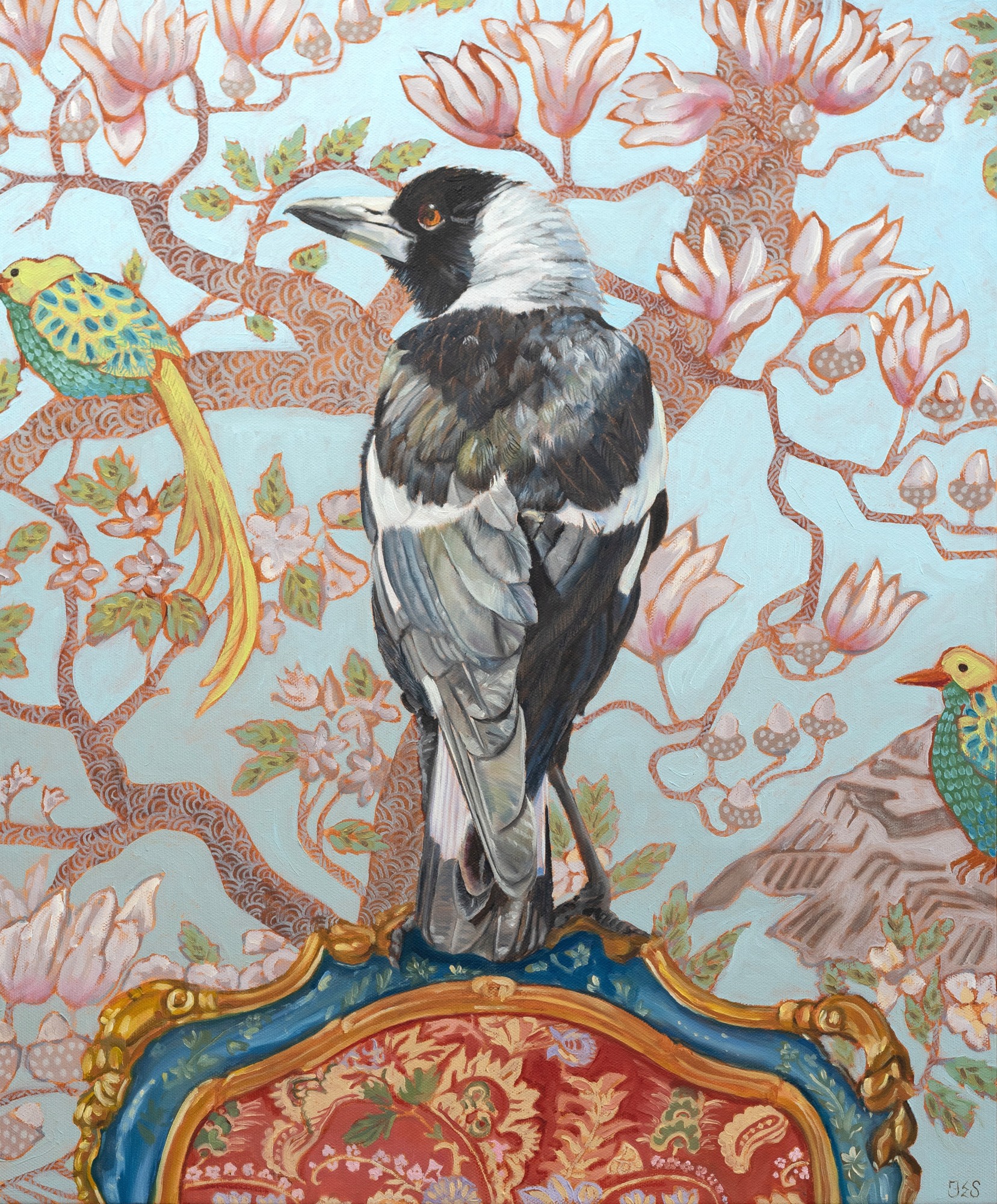 This magpie is perched on a 1750s Venetian Rococo Parcel-Gilt Painted Armchair. Th wallpaper in the background is based on GP & J Baker’s Rockbird.