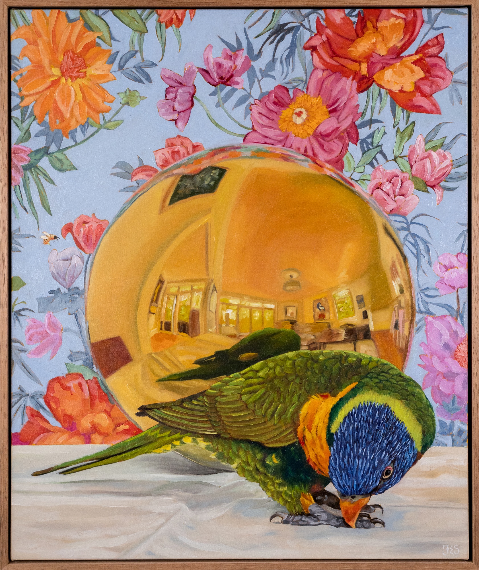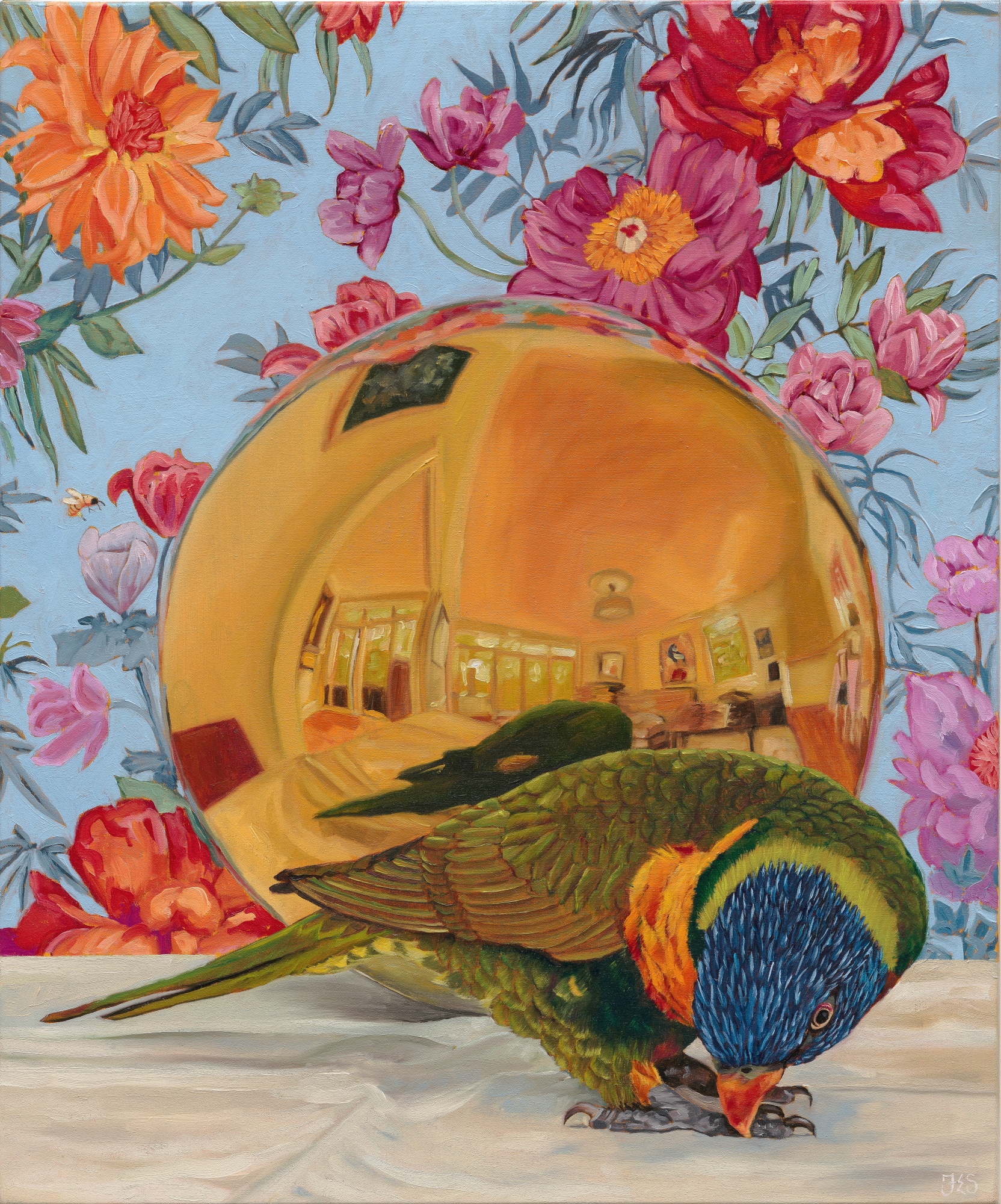 The Frog Prince by the Brothers Grimm is the story of a spoiled princess who reneges on her promise to kiss the frog who rescued her golden ball from a pond. The frog, of course, is a handsome price who has been turned into a frog by a wicked fairy. This tableau has been constructed with the help of one of our neighbourly rainbow lorikeets, a garden ornament bought online and some wrapping paper from my cupboard.