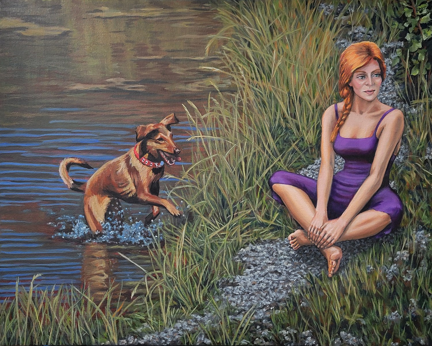 Strong Chance of Showers by Fletcher Hayes  Image: A frisky dog emerges from a swim in the river to greet a serene redhead woman