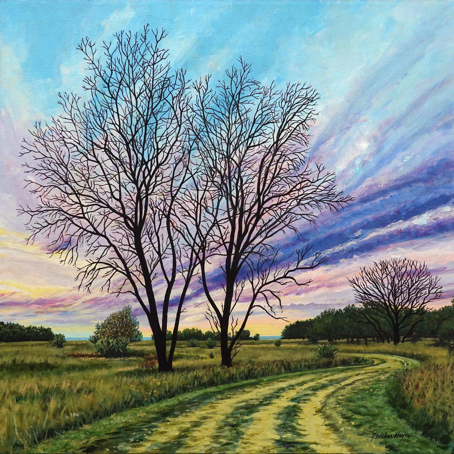 Magic hour illuminates the path to Lake Michigan that winds around the two bare trees.