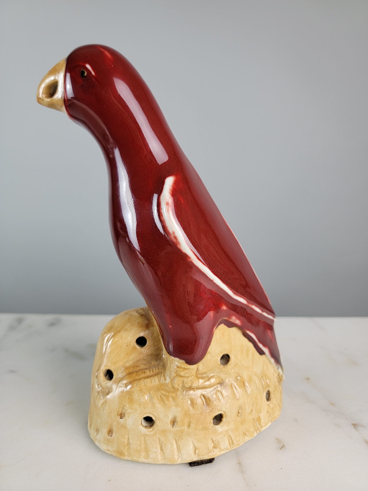This is a charming Chinese export famille vert hand-painted ceramic parrot. It is likely from the late 19th century or early 20th century.