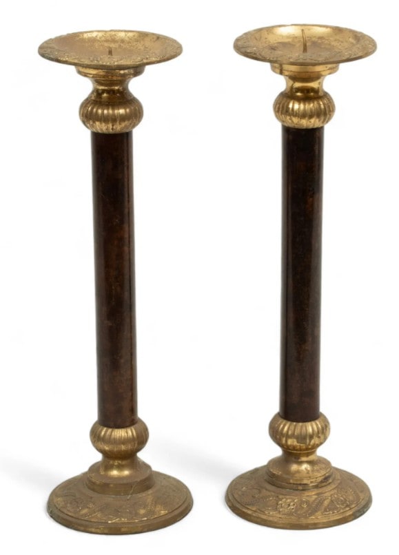 English Brass And Tole Candlesticks, Ca. Mid 19th Century. Brass bases and cups has low relief floral designs and central tole column has a faux-stone pattern.