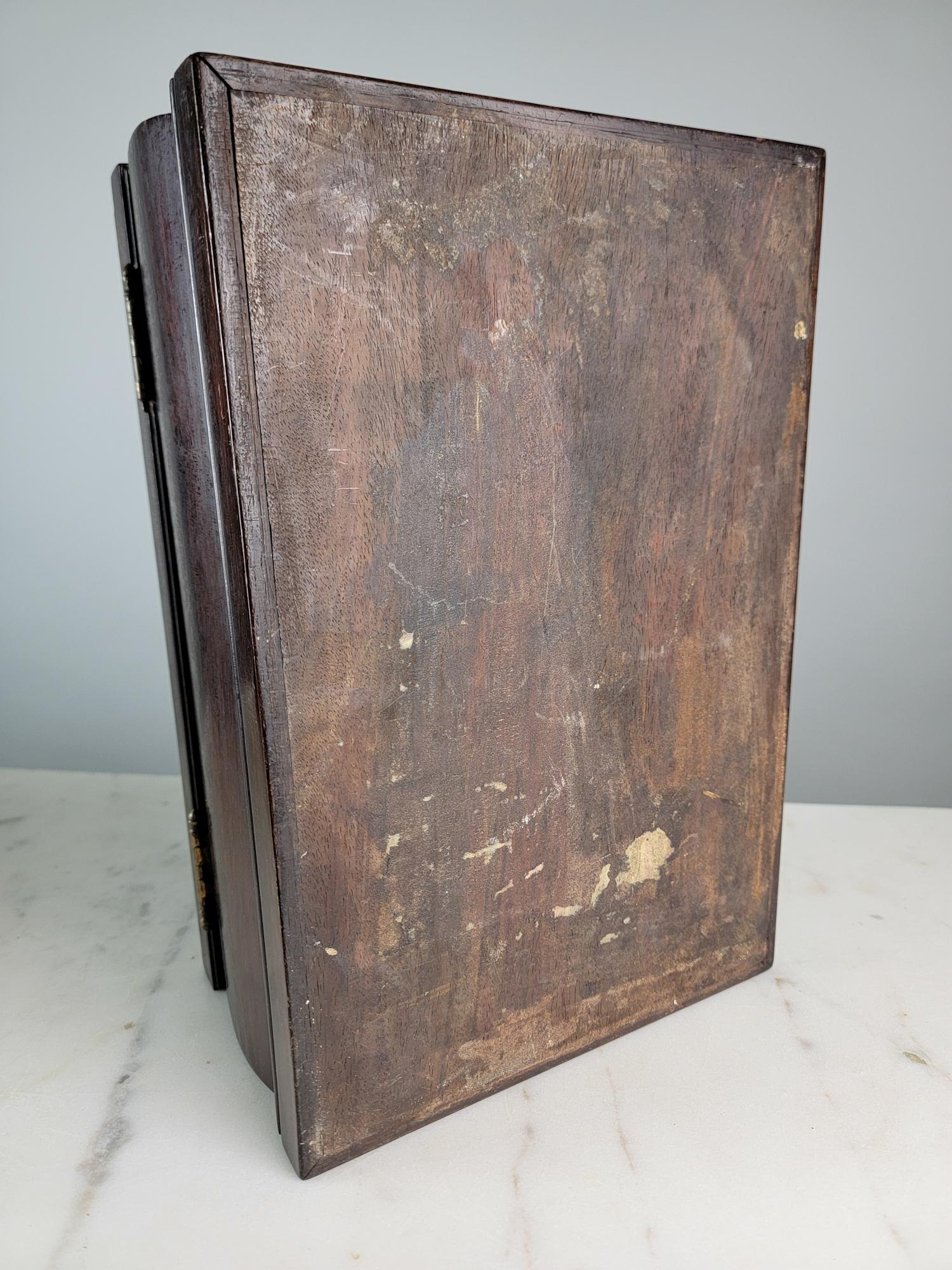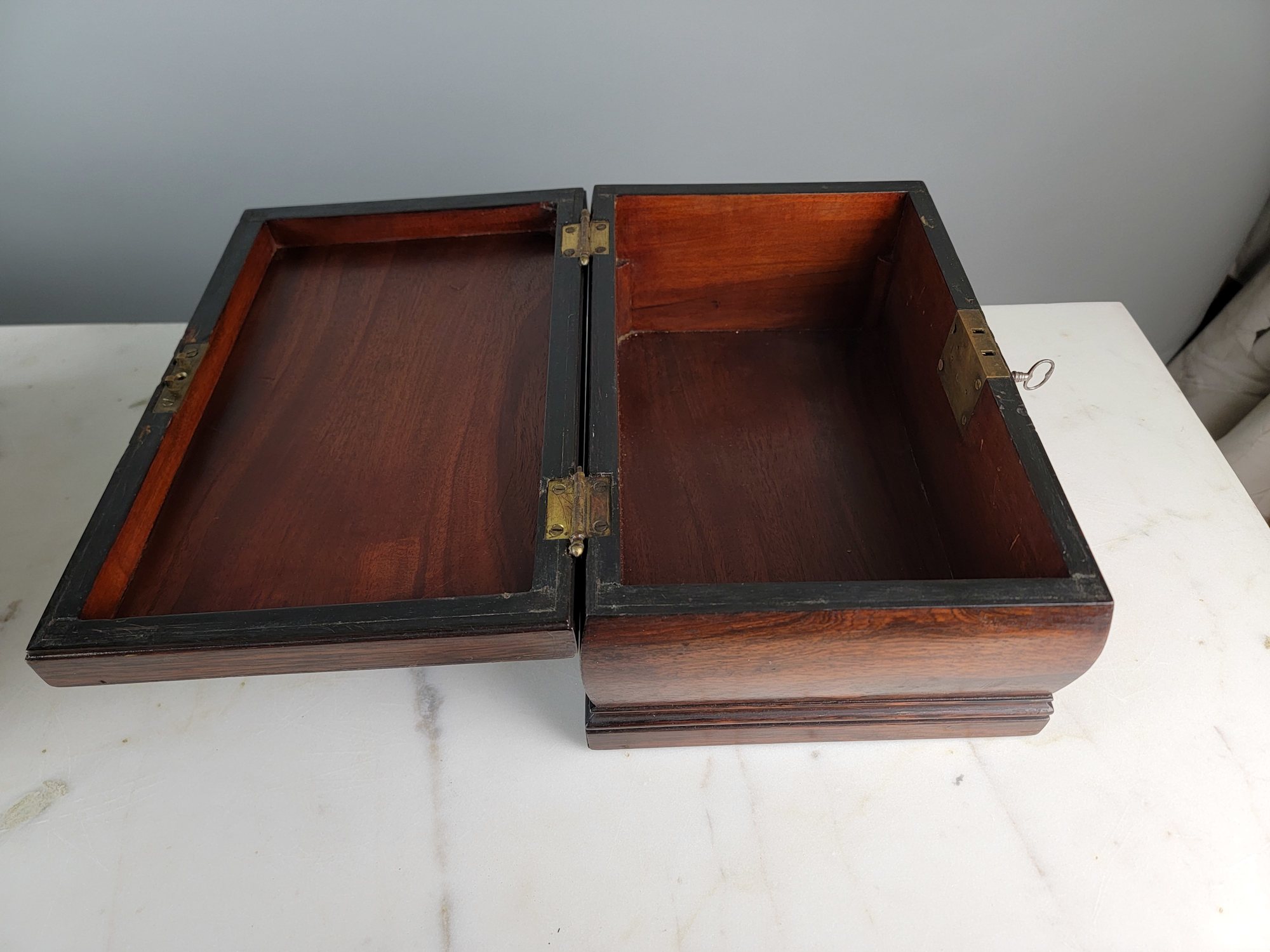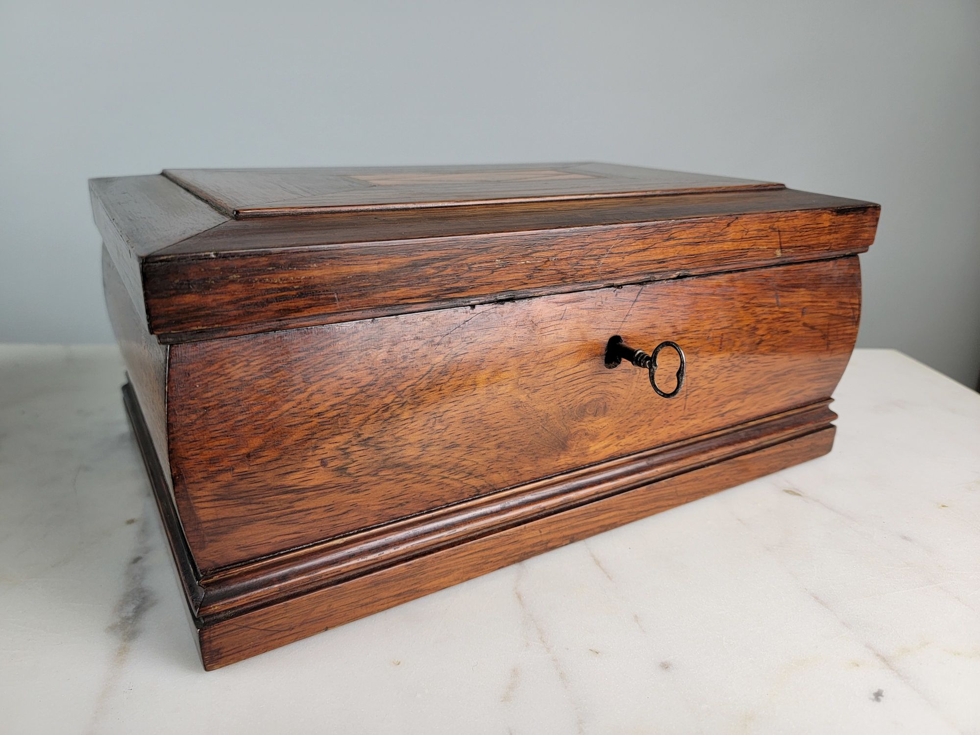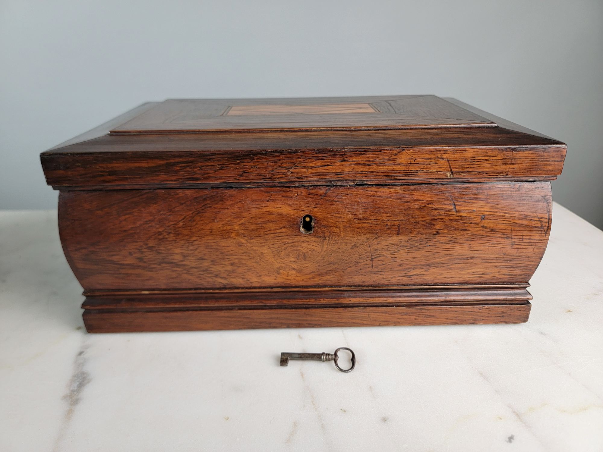 This handsome solid wood box was done in a precise two tone wood veneer. Box is locked and unlocked with a special skeleton key.