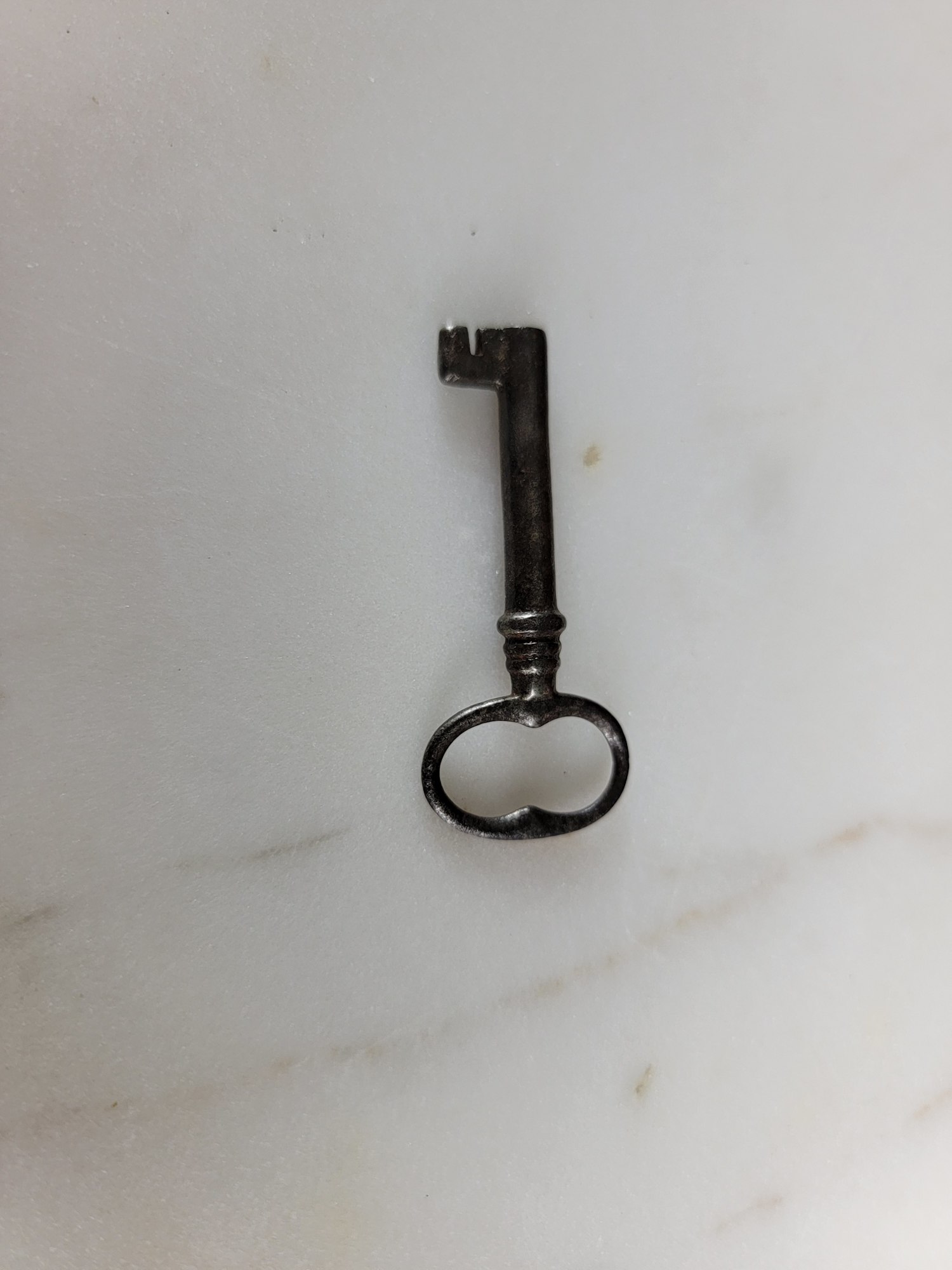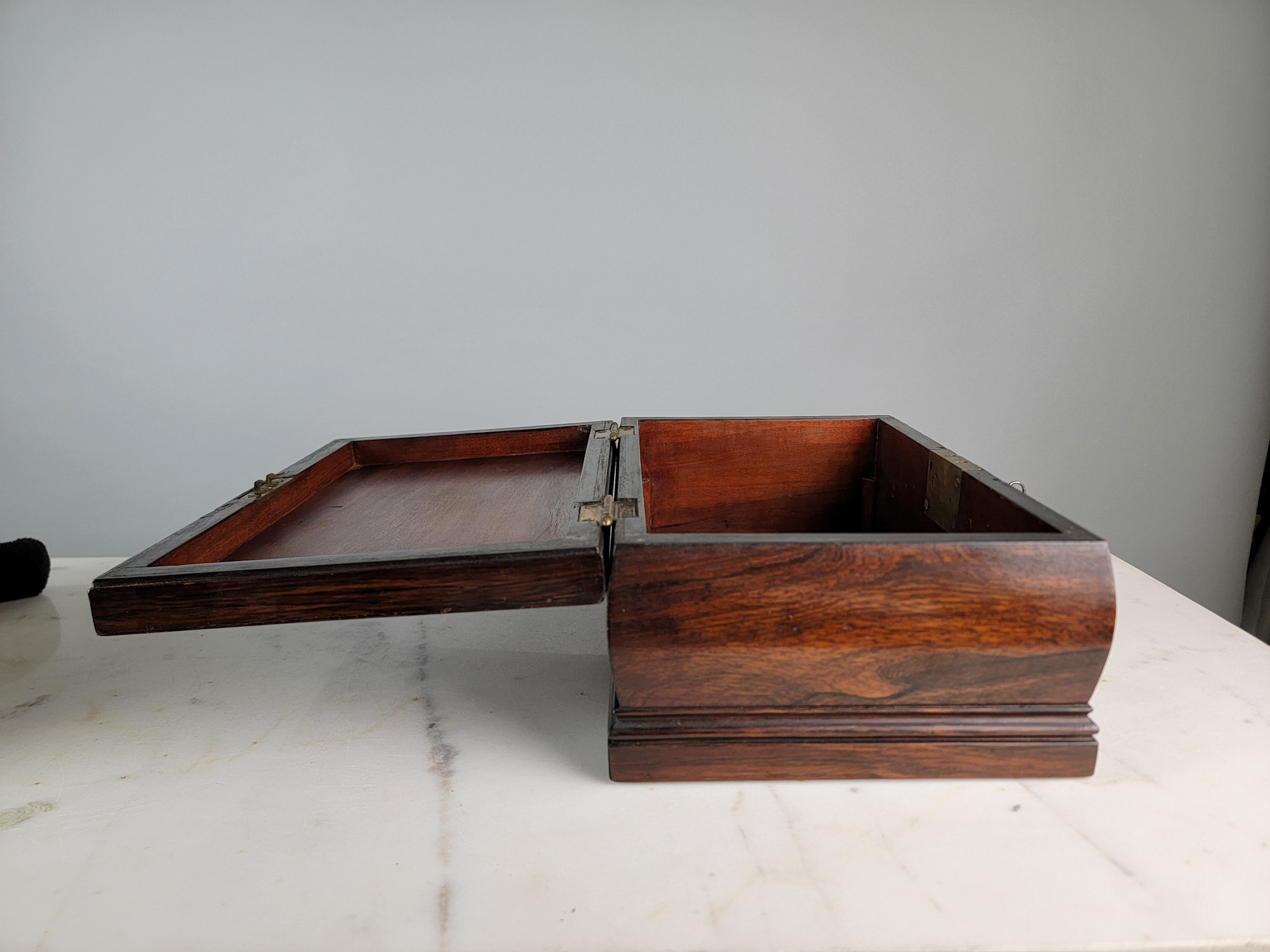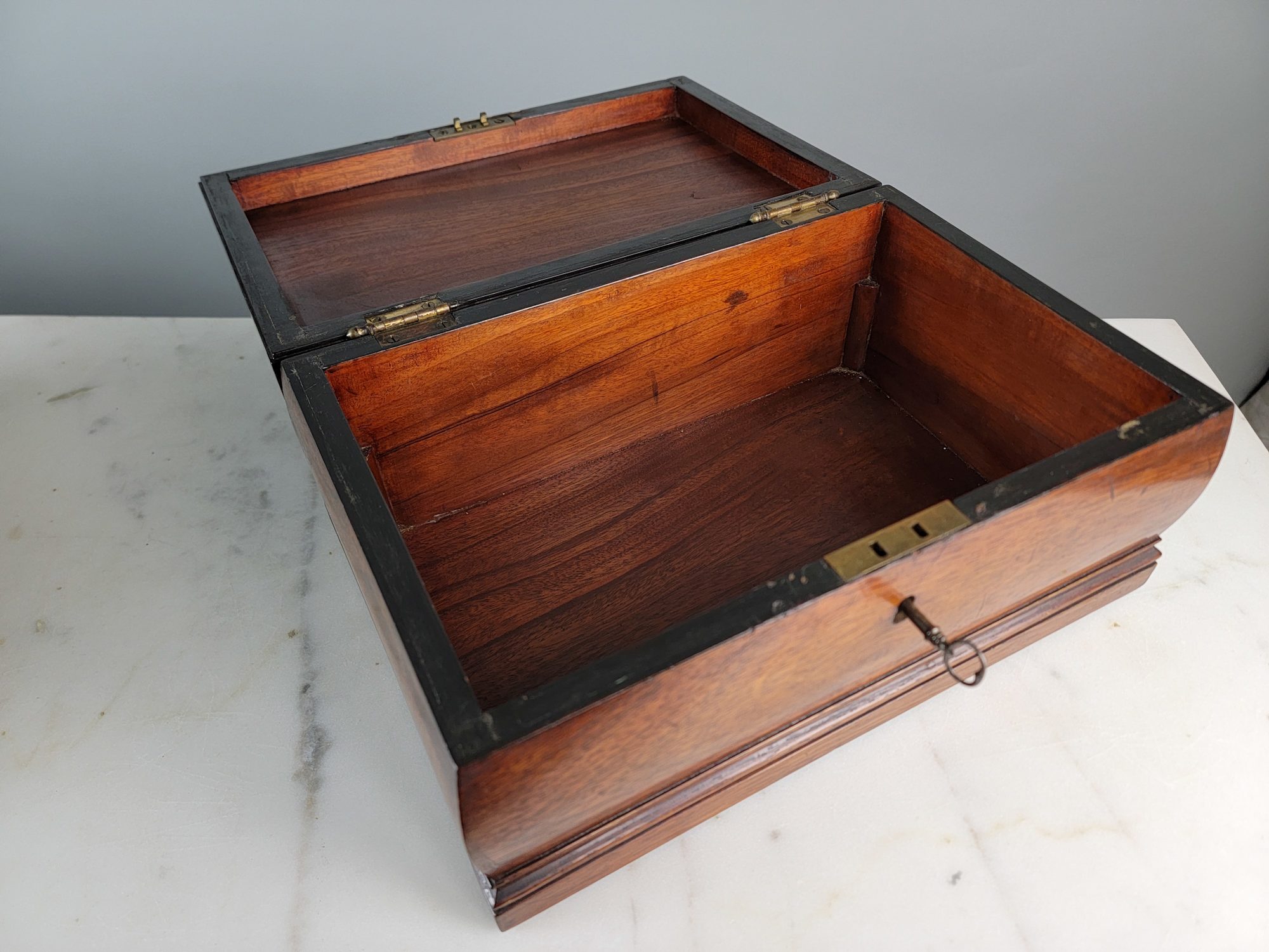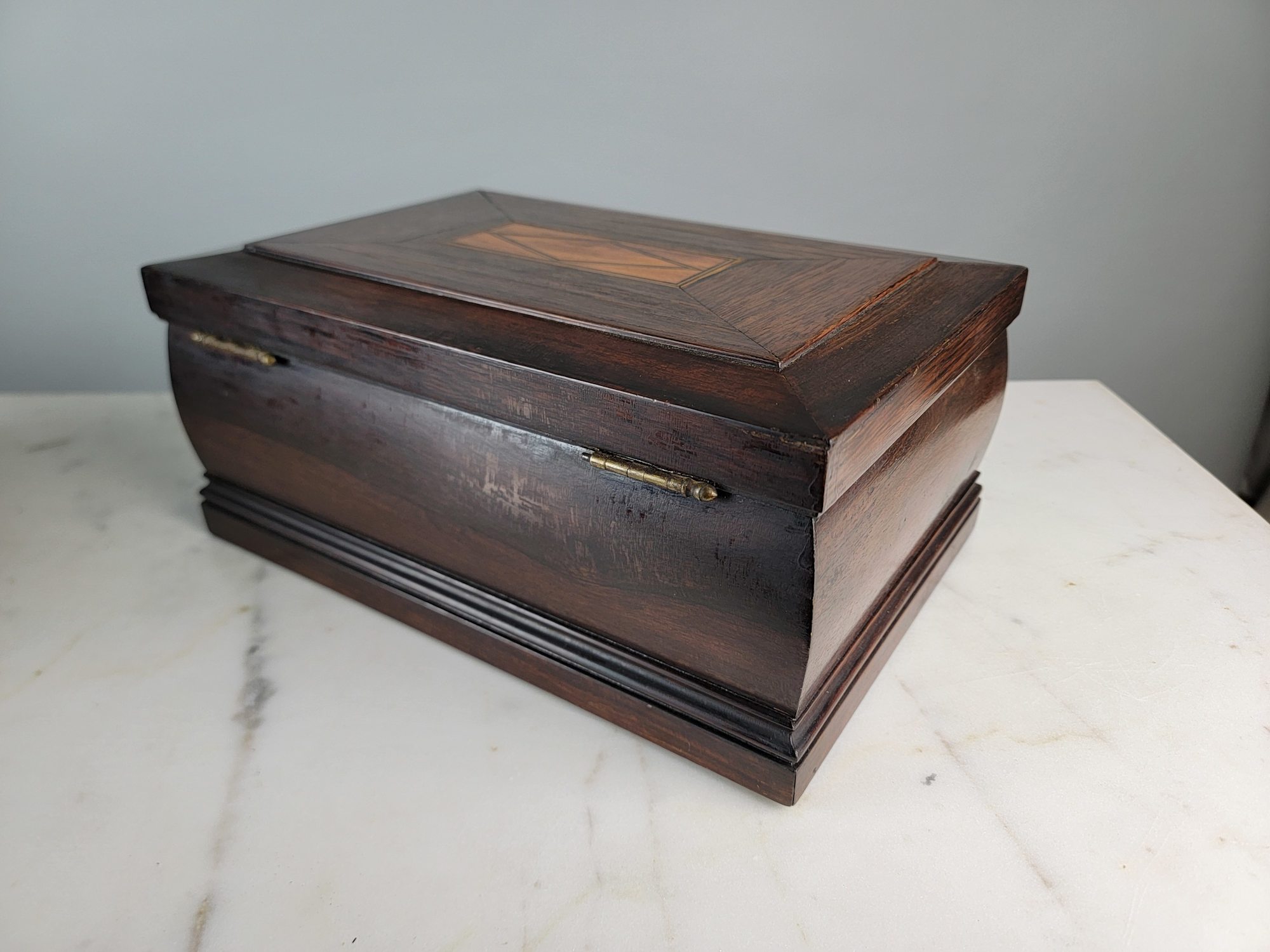This handsome solid wood box was done in a precise two tone wood veneer. Box is locked and unlocked with a special skeleton key.