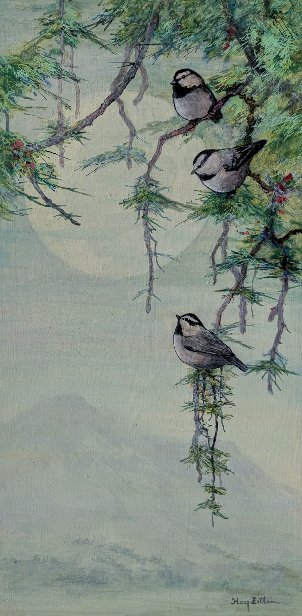 In June we traveled to bird in the Sierras and the Mountain Chickadees we found in several spots inspired this painting.