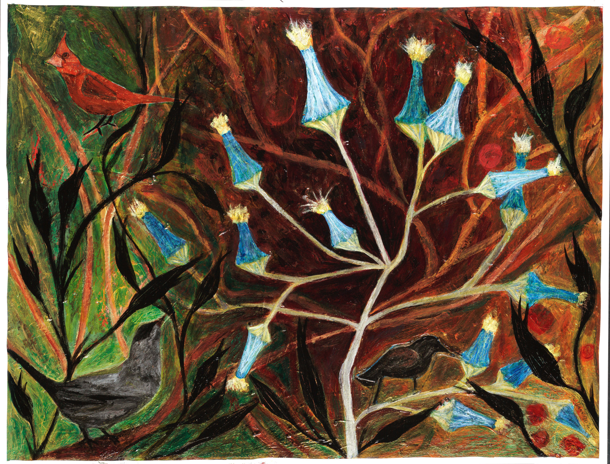 - Catbird Cardinal, 2021, acrylic and collage on paper, 20 x 25.5, $1800 framed, 2021