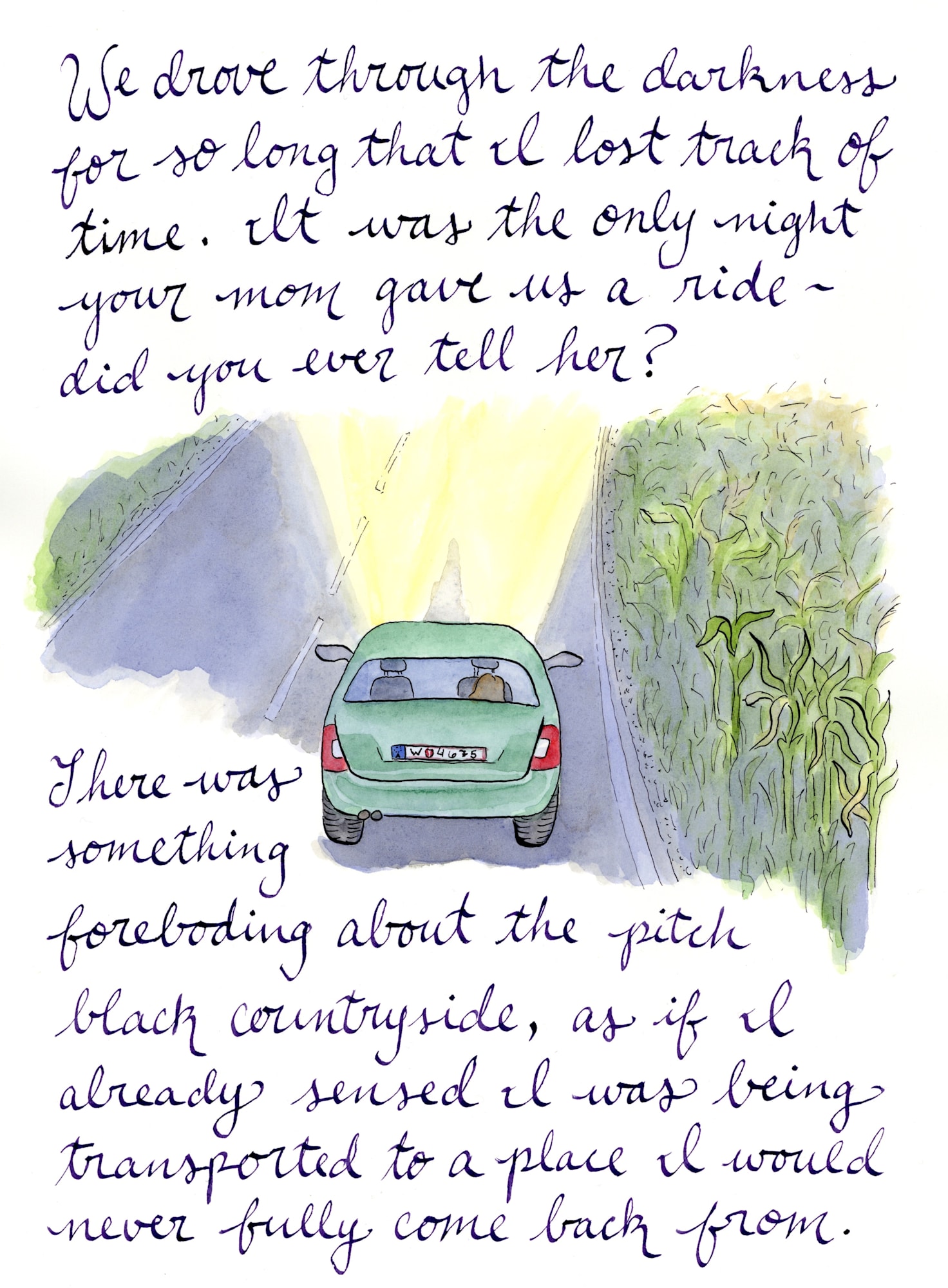 This page from the Dear Mini: A Graphic Memoir, Book One takes place midway through the book. Teenage Natalie is visiting her friend Mini in Austria on a night that will change the course of both of their lives.