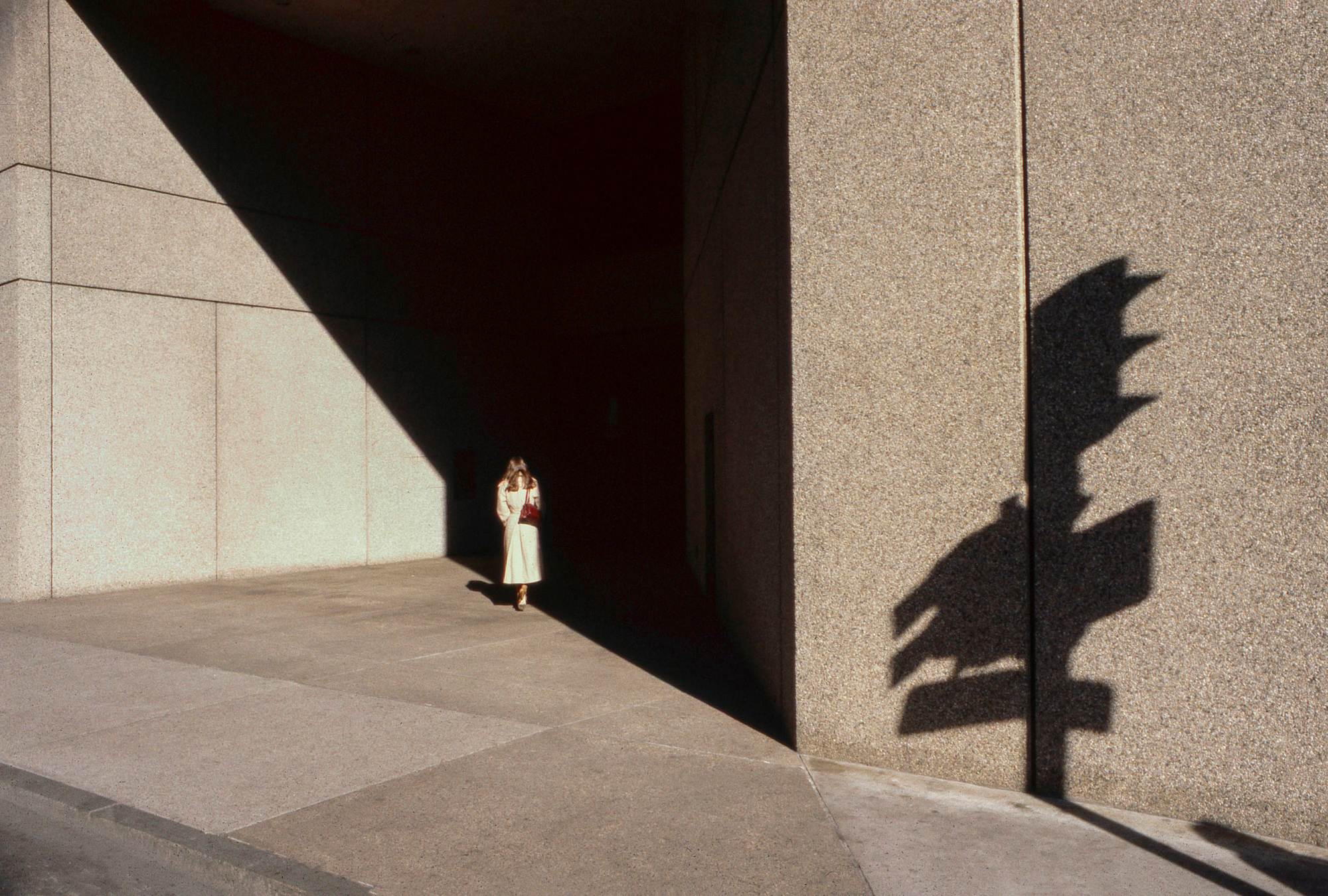 The photograph captures a solitary figure, a woman, positioned between shadow and sunlight, with the stark geometry of the urban landscape surrounding her. She is centered in a concrete alcove of a modern architecture - a corner of a building. The composition is alive with contrasts, not just with the play of light and dark, but also in the textures and the scale of human versus structure. One of the walls casts a sharp, angular shadow that stretches across the frame, creating a diagonal division of the space. On the right, an intriguing, larger-than-life shadow of a street light projects onto the wall. This juxtaposition of the real and the silhouette adds a layer of narrative and symbolism to the visual experience.