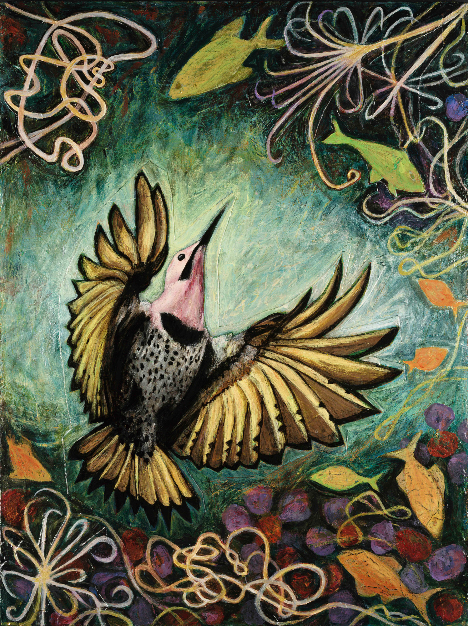- Subject Matter: flicker, woodpecker bird, fish, flight