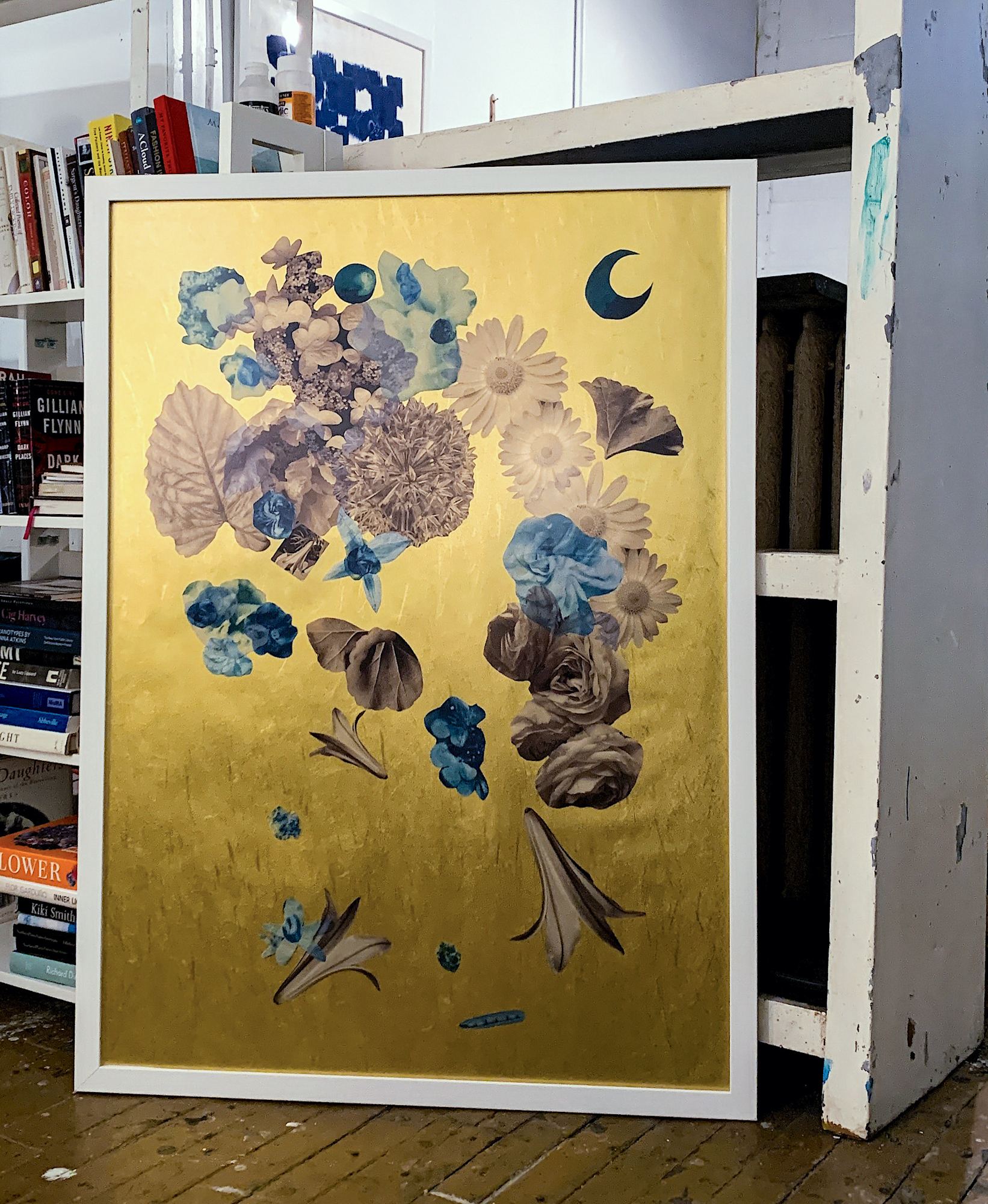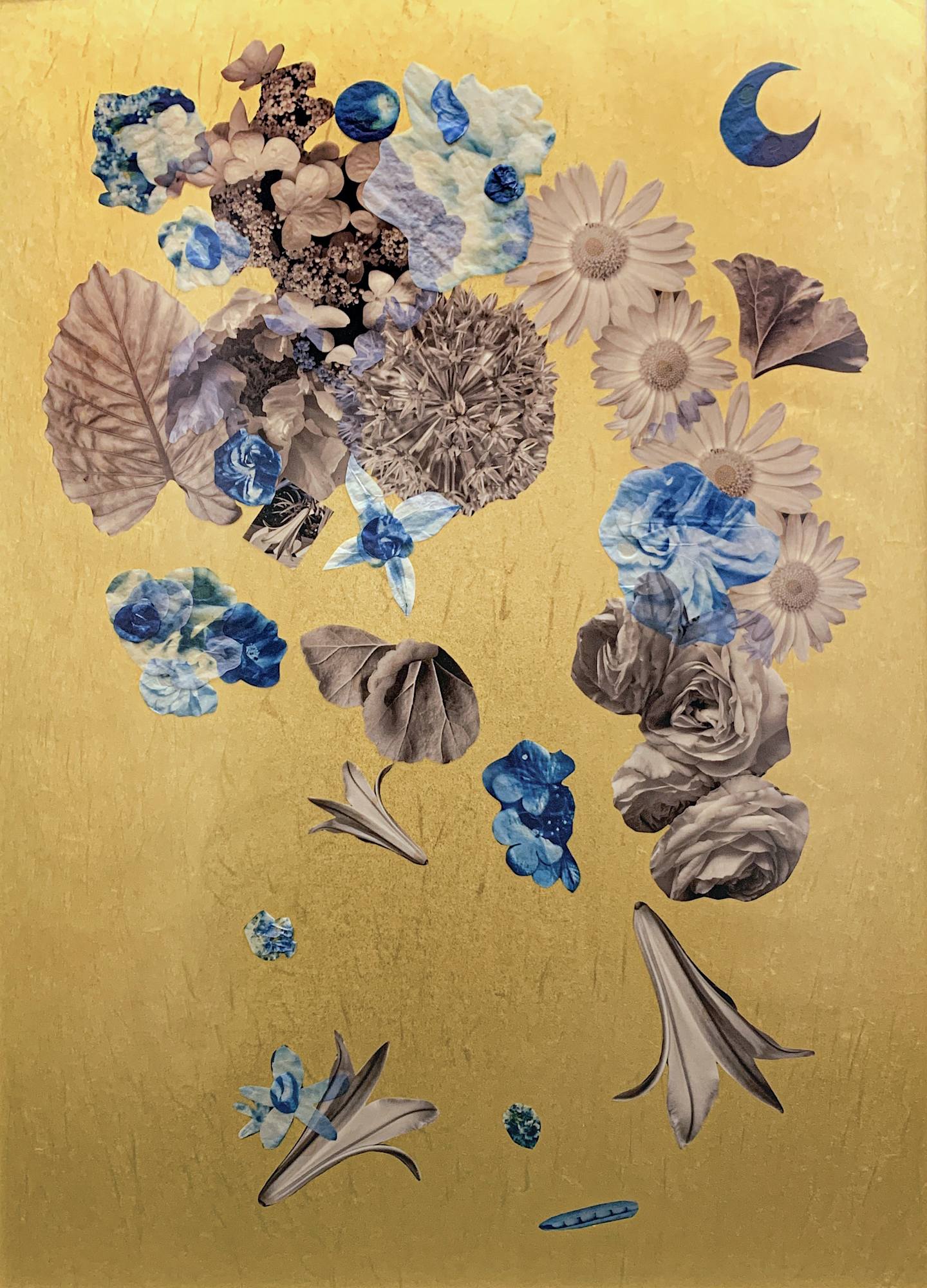 Handprinted cyanotypes on vellum and gampi papers with transparencies assembled on Japanese metallic paper