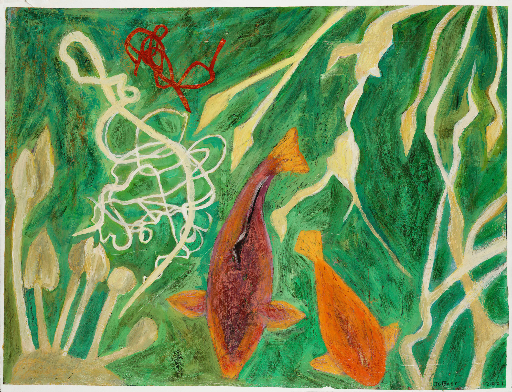 Koi, 2021, acrylic and collage on paper, 19 x 26, $2000 framed
