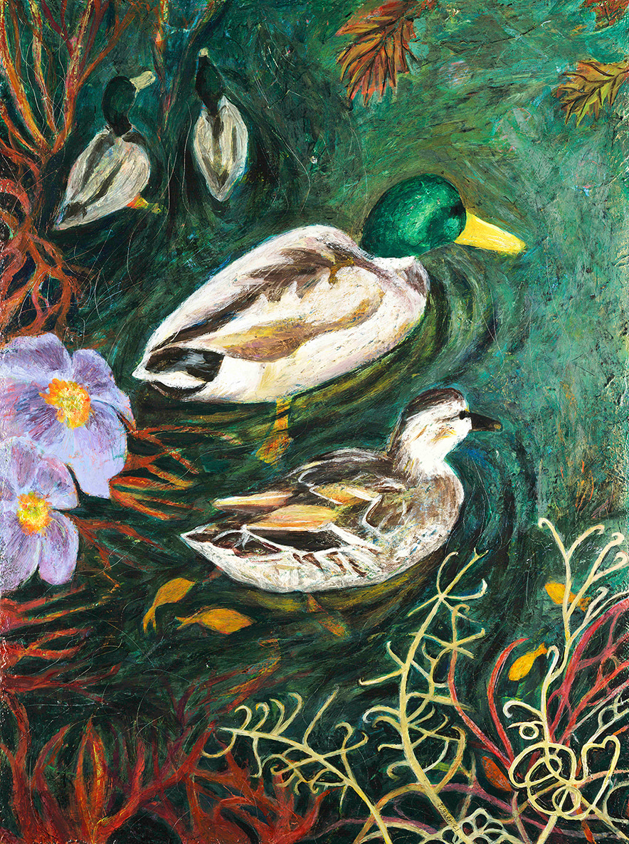 Mallards, 2021, acrylic and collage on wood panel, 32x24, $2400 unframed