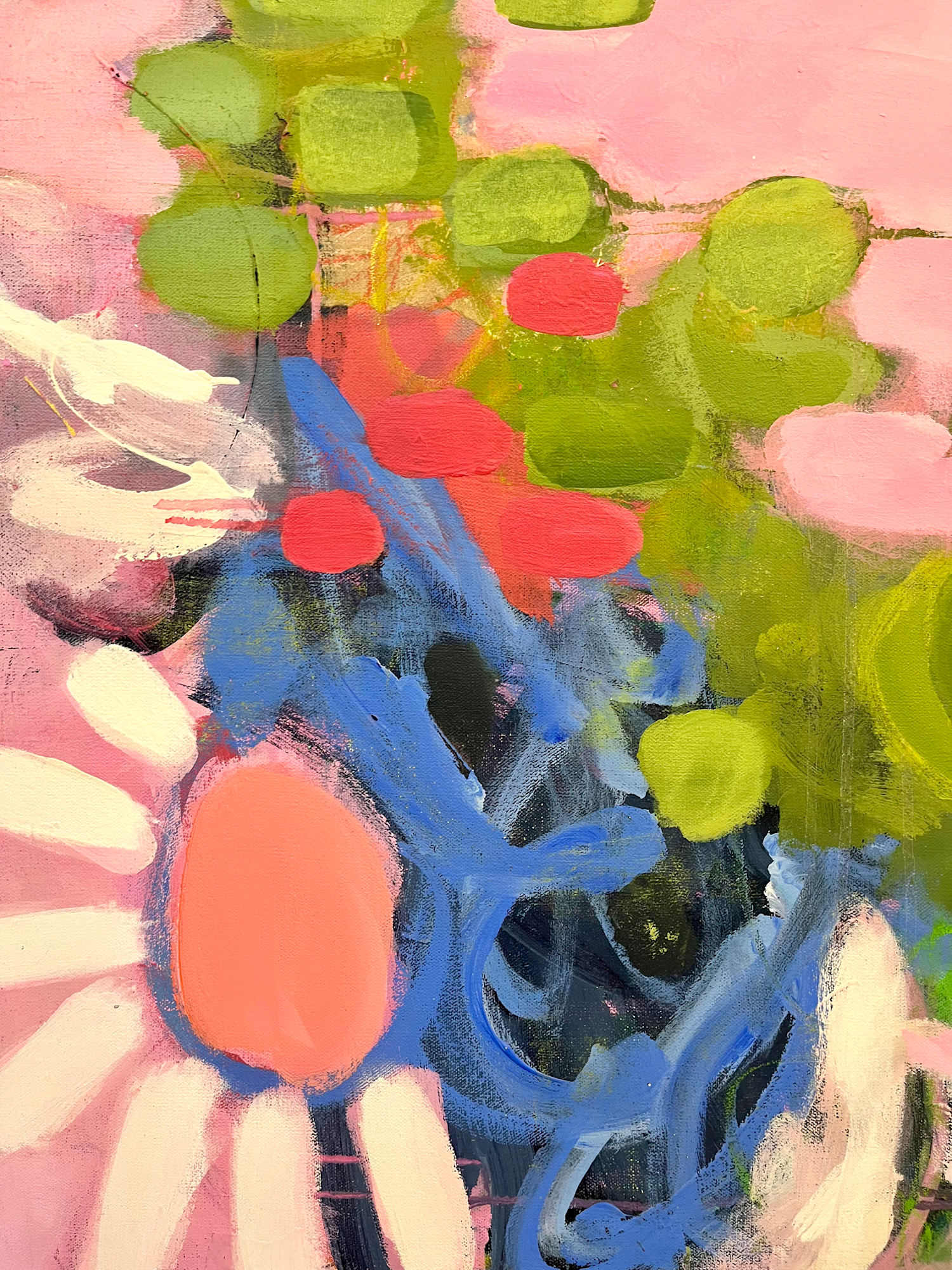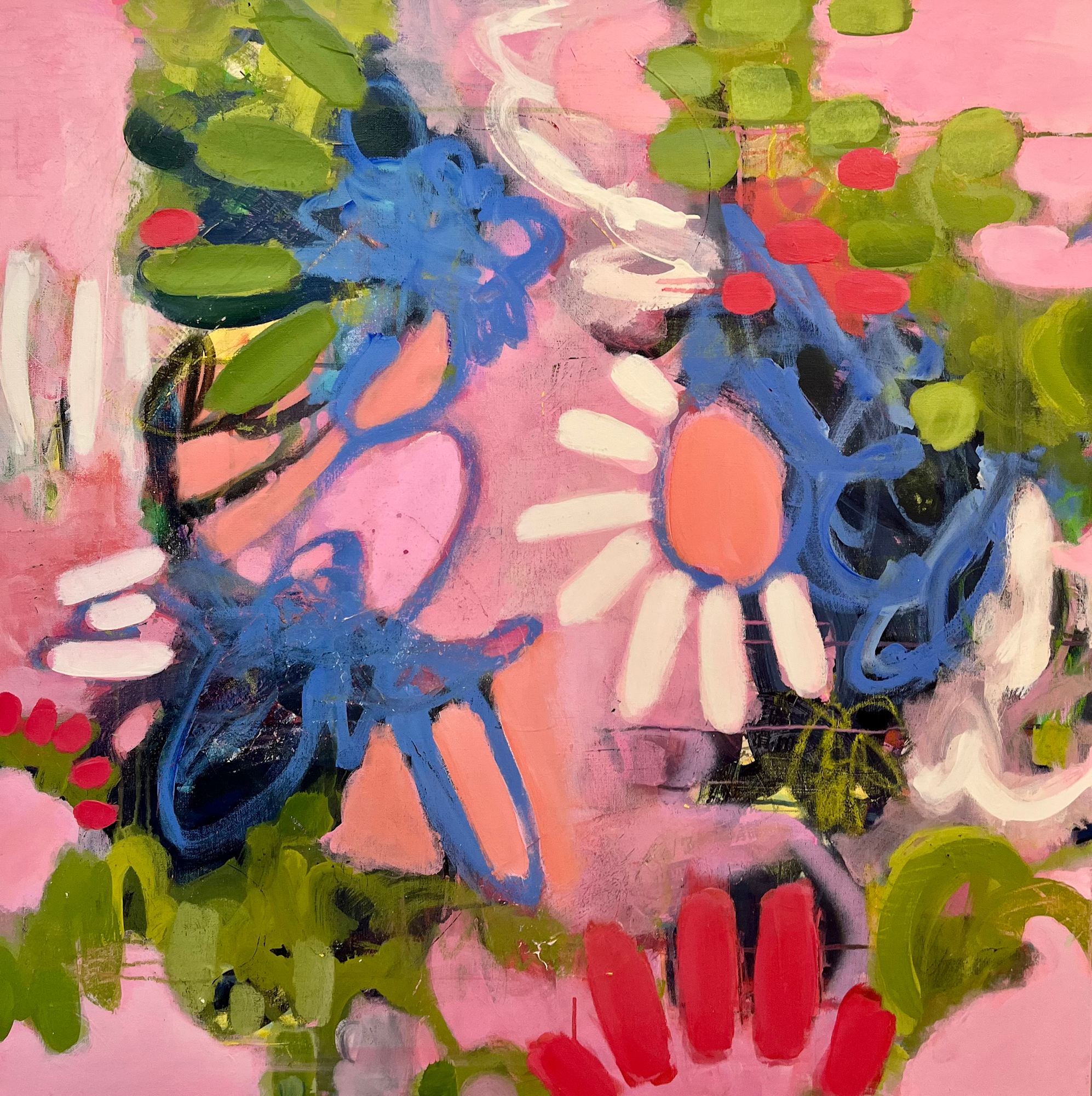 Colorful abstract painting with playful flowers and markings in shades of pink, green and blue.