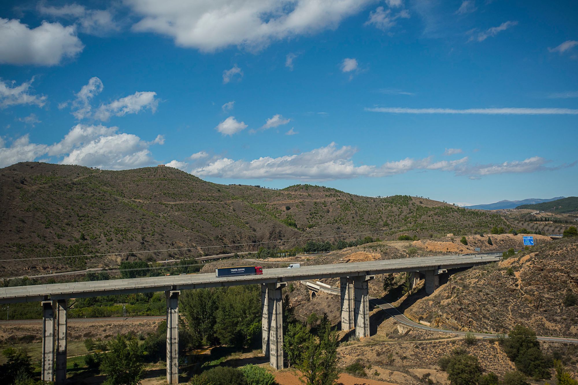 Horizontal color landscape photograph of a hiway and bridge with sun, blue sky and clouds.