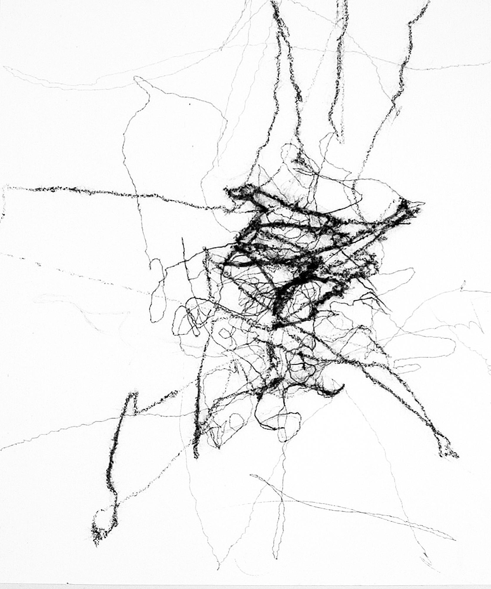 The jittery dancing lines in “With or Without You” are made with a ball bearing and black iron oxide. The lines dance out of reverie and dreams. And from journeys of imagination about the past, created in the present, to be dreamt again in the future. The drawing is about what you need it to be right now.