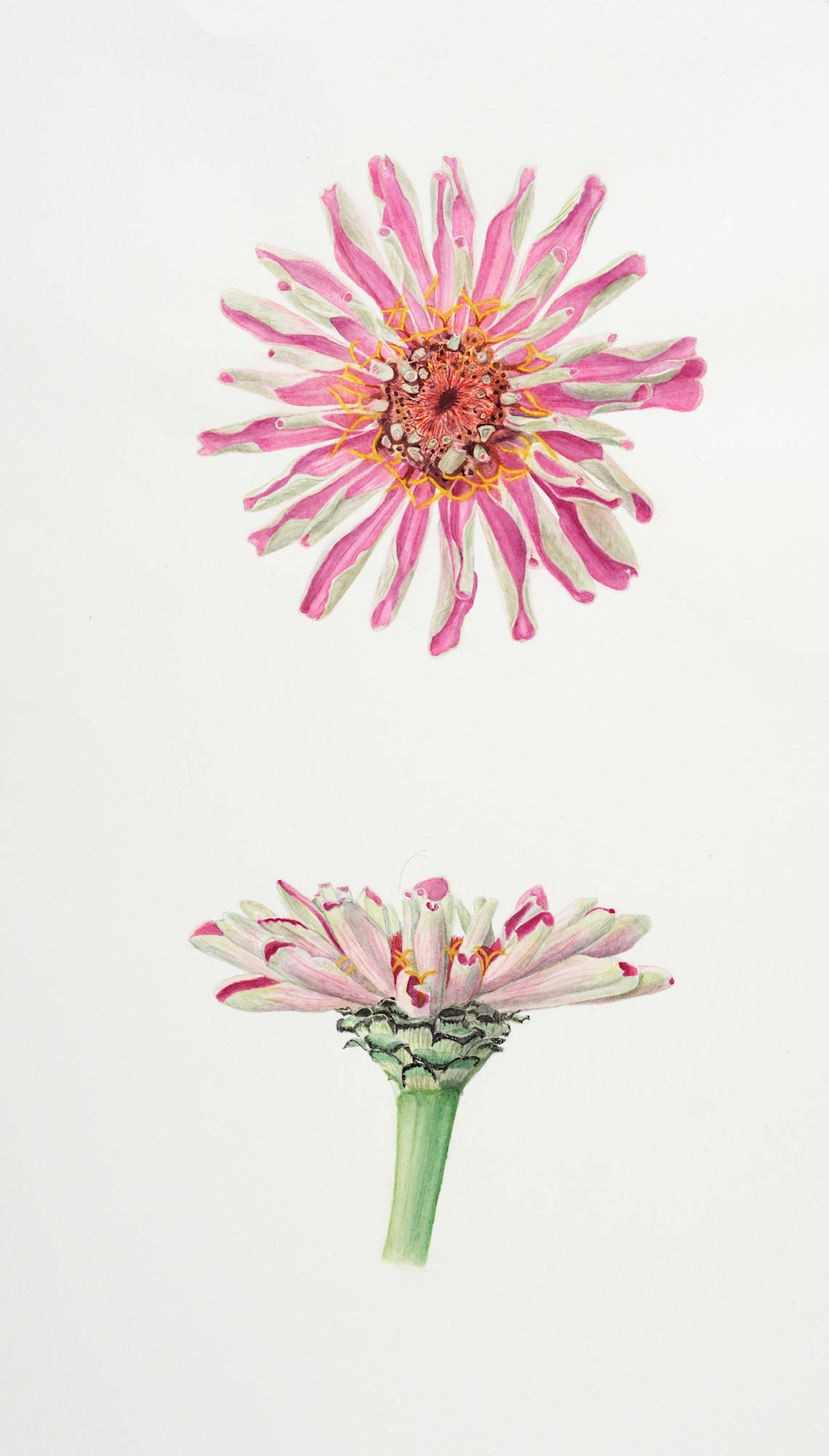 Zinneas have always fascinated me. I decided to paint one larger than life to depict the details often missed when glancing at Zinneas growing in gardens. By enhancing the size, one can see the center intricacies to each petal that is opening. The side view shows the bottom structure from which the petals emerge. Removed from it’s surroundings, it does have a quasi-abstract effect.