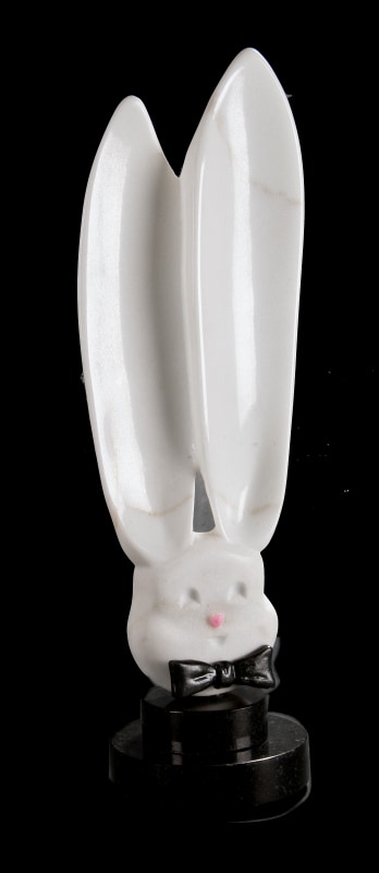 - Subject Matter: A bunnie head with a pink nose and a black bowtie mounted on a two tiered African Granite base