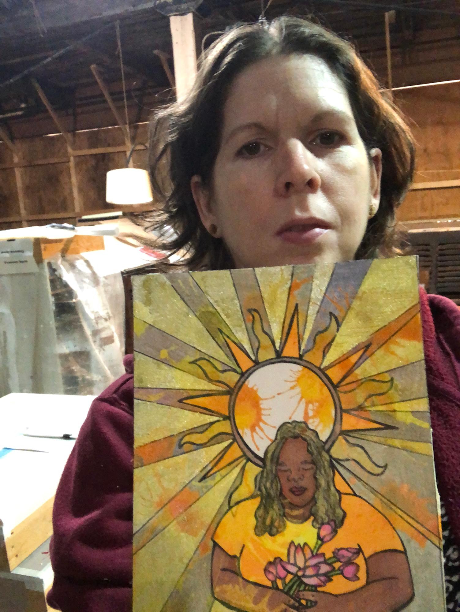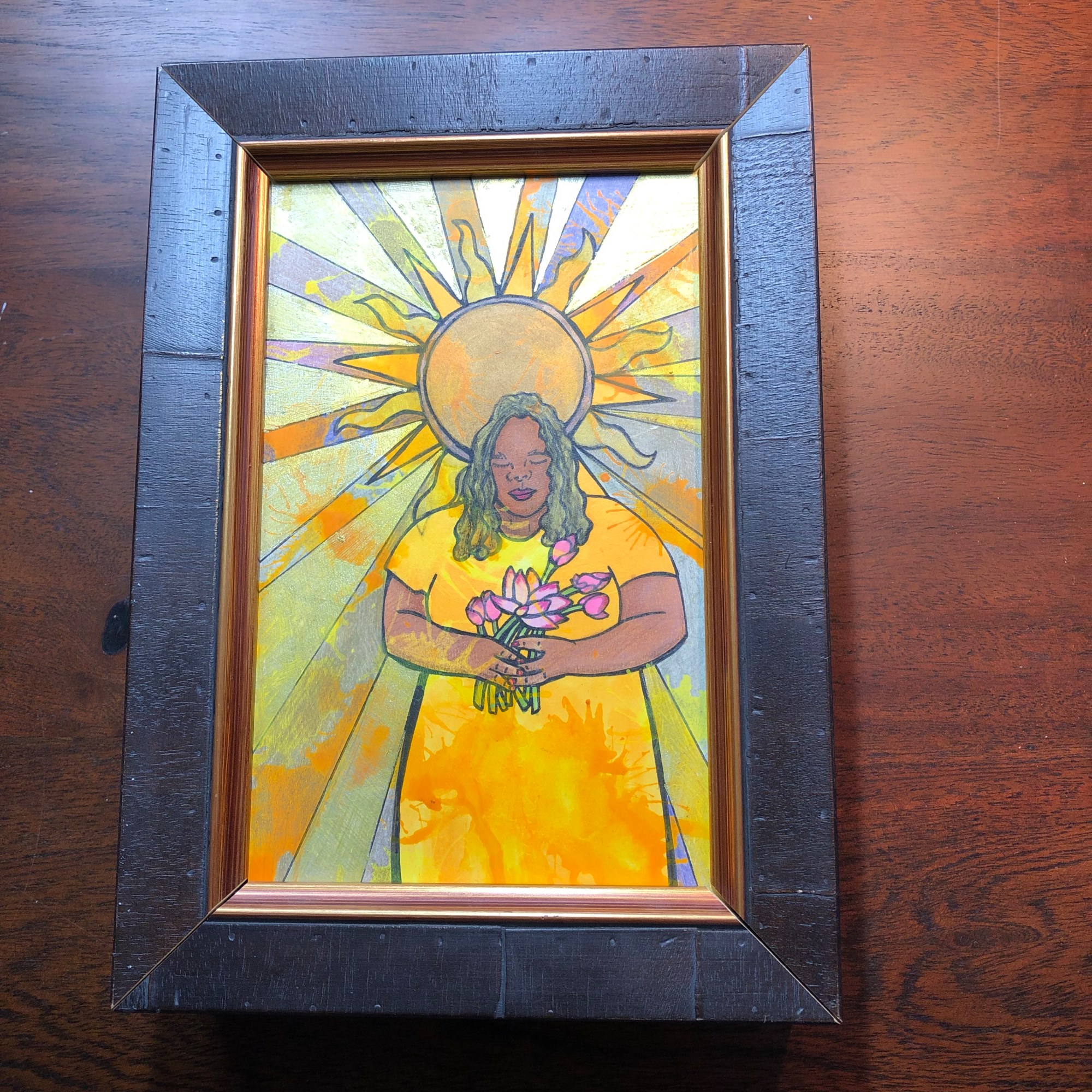 This portrait of my friend Anita was created for a local hair salon. I used a variety of mixed media on this portrait, including: acrylic inks, alcohol markers, colored pencils, gel and fine liner pens, and acrylic paint. The piece is on a base of illustration board and has been sealed with acrylic gel medium.