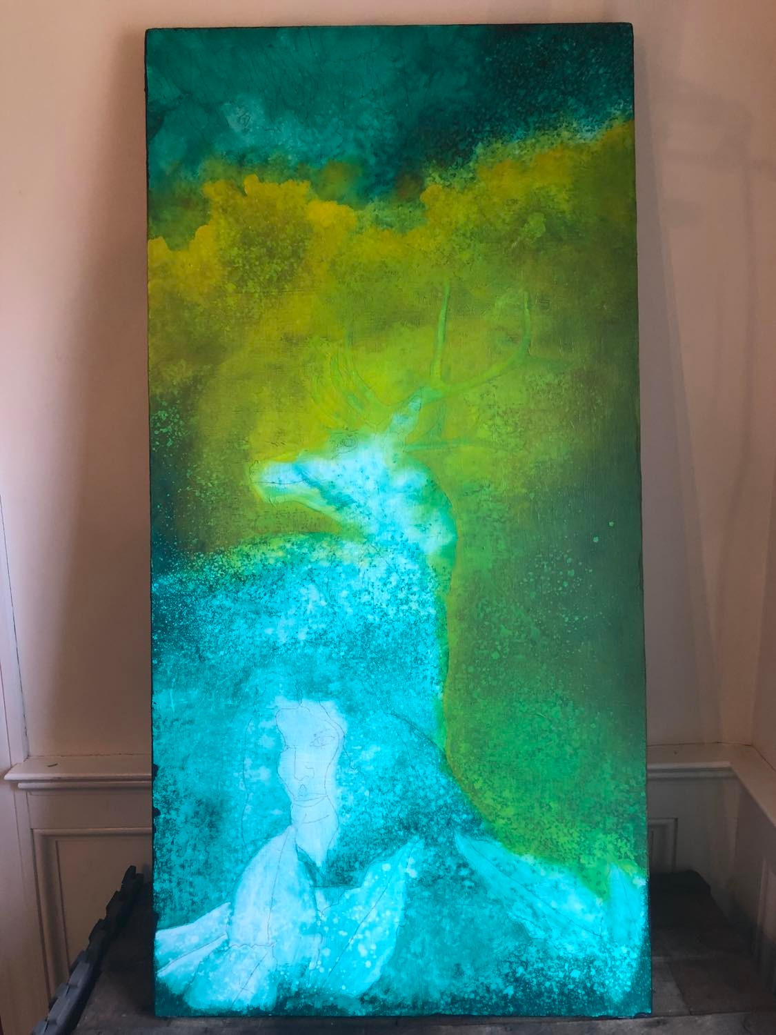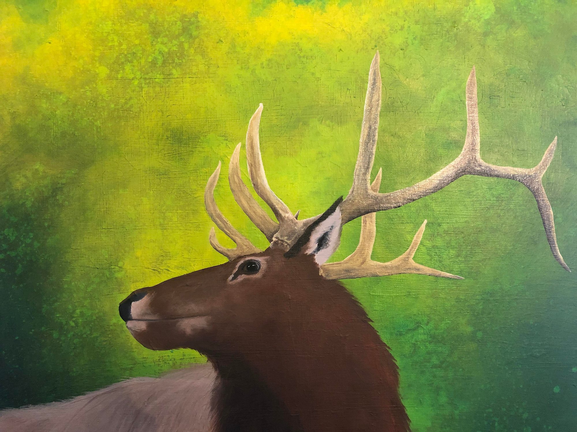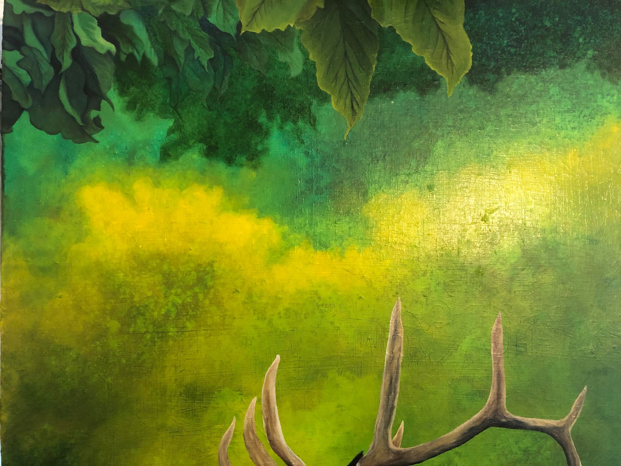 In this painting I am examining the inter-connectedness of man and nature, and the tranquility found in embracing the beauty of nature. The hart is loosely modeled on the American elk and is modeled after a reference photo I took of a trophy I found in a small mountain mercantile. The setting is a granite outcropping in a birch grove, tying in one of my favorite trees to symbolize my love of the forest and ethereal environments. The reference photos for this painting were taken at the same location as the photos I used for my Study for a Dryad painting.
