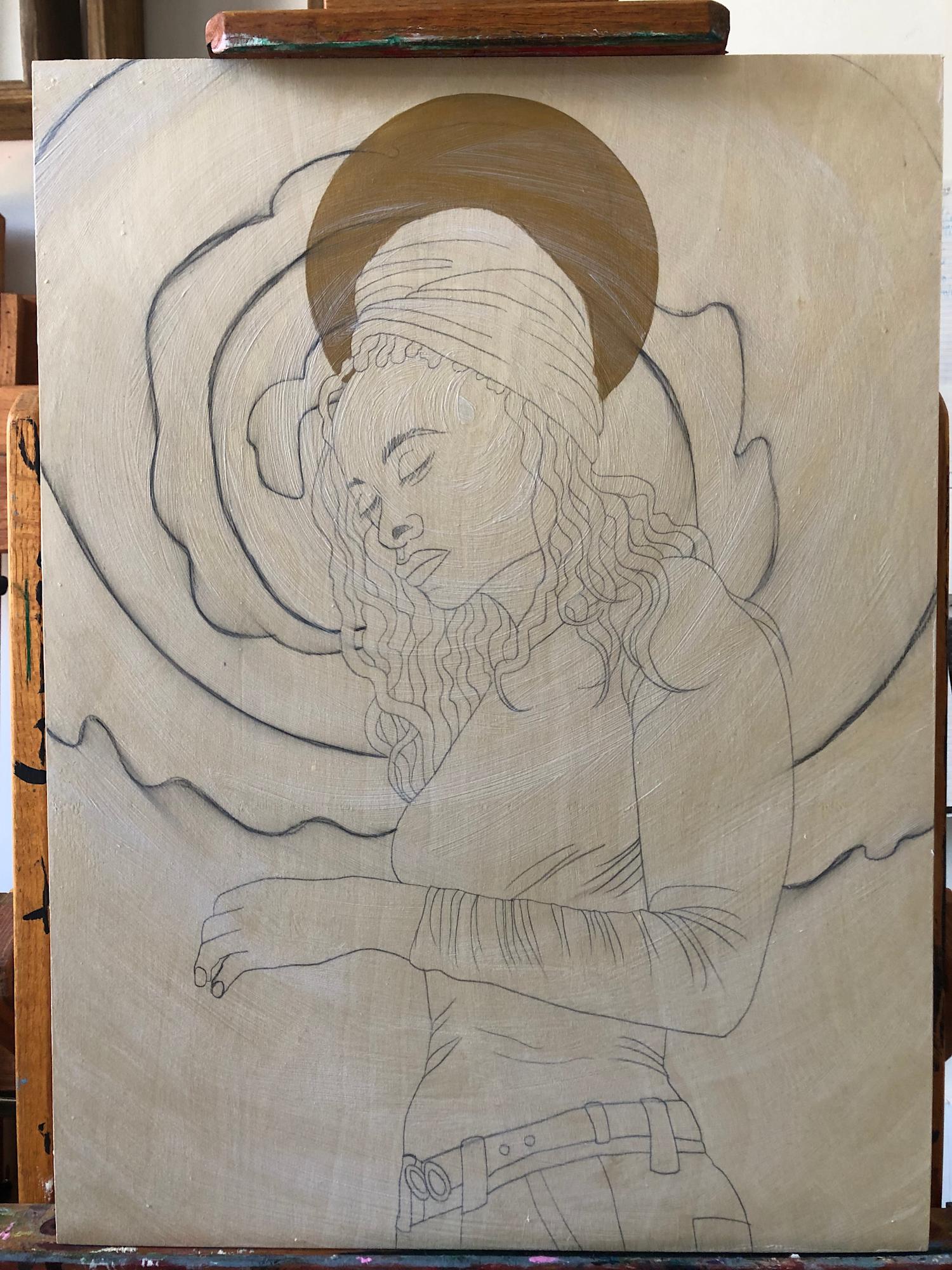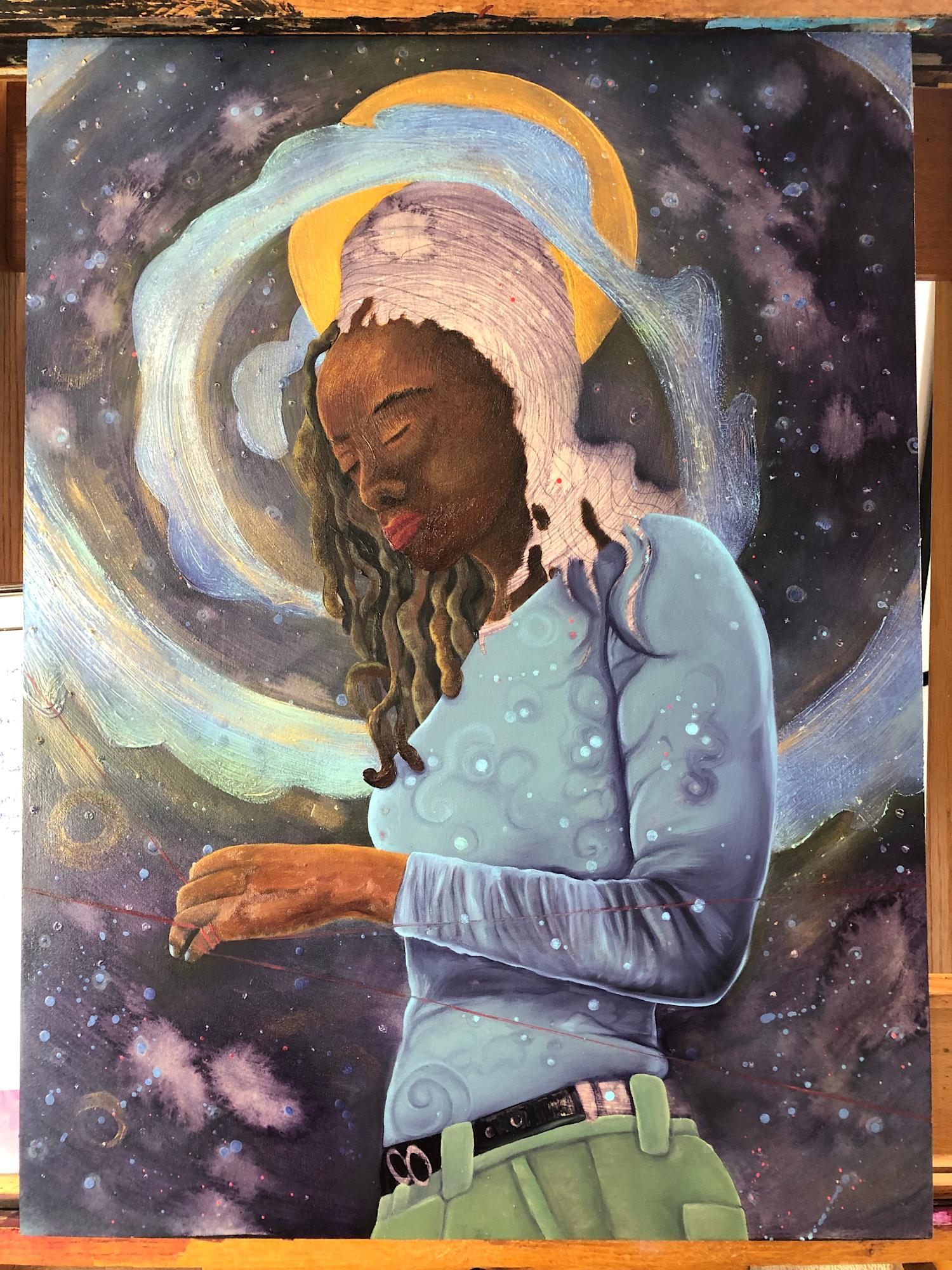 This portrait of a strong, central figure explores both the duality of the individual and her interconnectedness to humanity and the universe. The celestial backdrop implies infinite possibilities, awe-inspiring systems larger than ourselves, and the beauty of self-reflection. The soothing color scheme and spiral symbolism worked into the cosmos surrounding the figure serve to move the eye around the composition and imply the origin of our existence. We are figuratively stardust, as some believe – infinite and simultaneously miniscule, but beautiful, regardless.