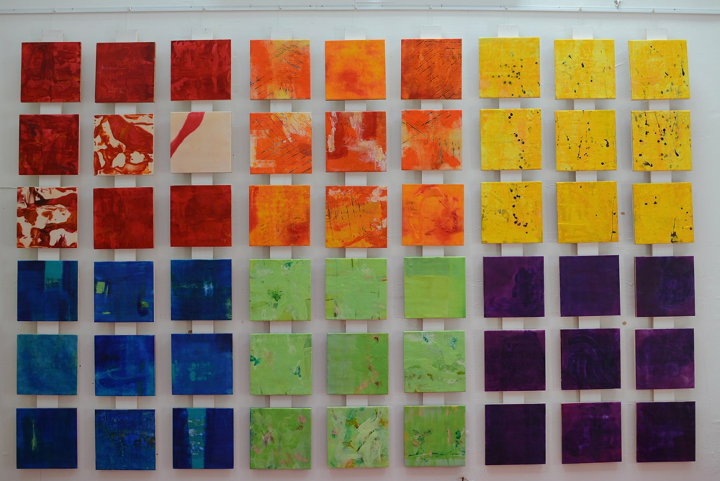 54 - 10" x 10" panels of color associated with the Chakras. Individual panels can be re-arranged. Panels hang on 9 wood rails.