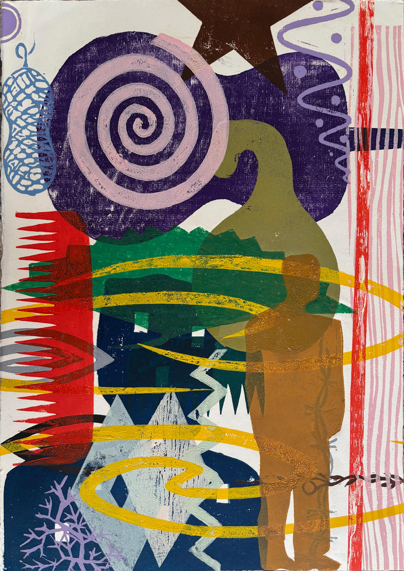 This piece is in excellent condition and has never been exhibited before. It was created by repeatedly layering relief prints, resulting in a rich, textured surface. The pressure applied during printing has left an embossed impression and traces of ink on the reverse side.