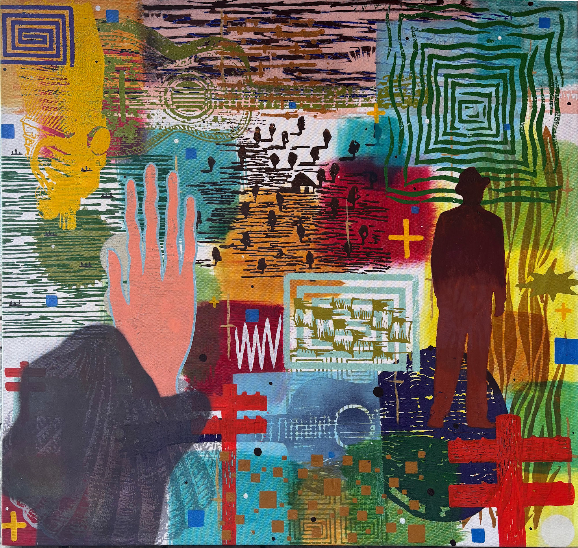 This piece was created by repeatedly layering relief prints, painting with a brush, and spray painting the work. This is a one-of-a-kind piece.
